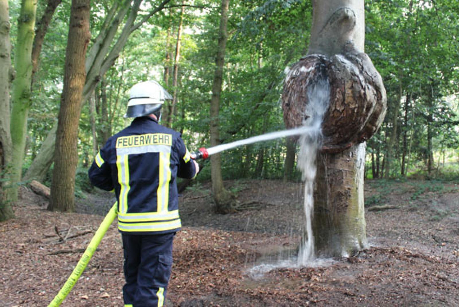 Die Feuerwehren aus Stapelmoor und Weener wurden gestern Abend um 18.33 Uhr zu einem Brandeinsatz im Stapelmoorer Park alarmiert. Aus ungeklärter Ursache brannte hier ein hohler Baum. Ein Passant hatte das Feuer Brand bemerkt und umgehend die Feuerwehr alarmiert. Erste Löschmaßnahmen wurden mittels Feuerlöscher vorgenommen. Parallel bauten die Einsatzkräfte eine 80 Meter lange Wasserversorgung auf.