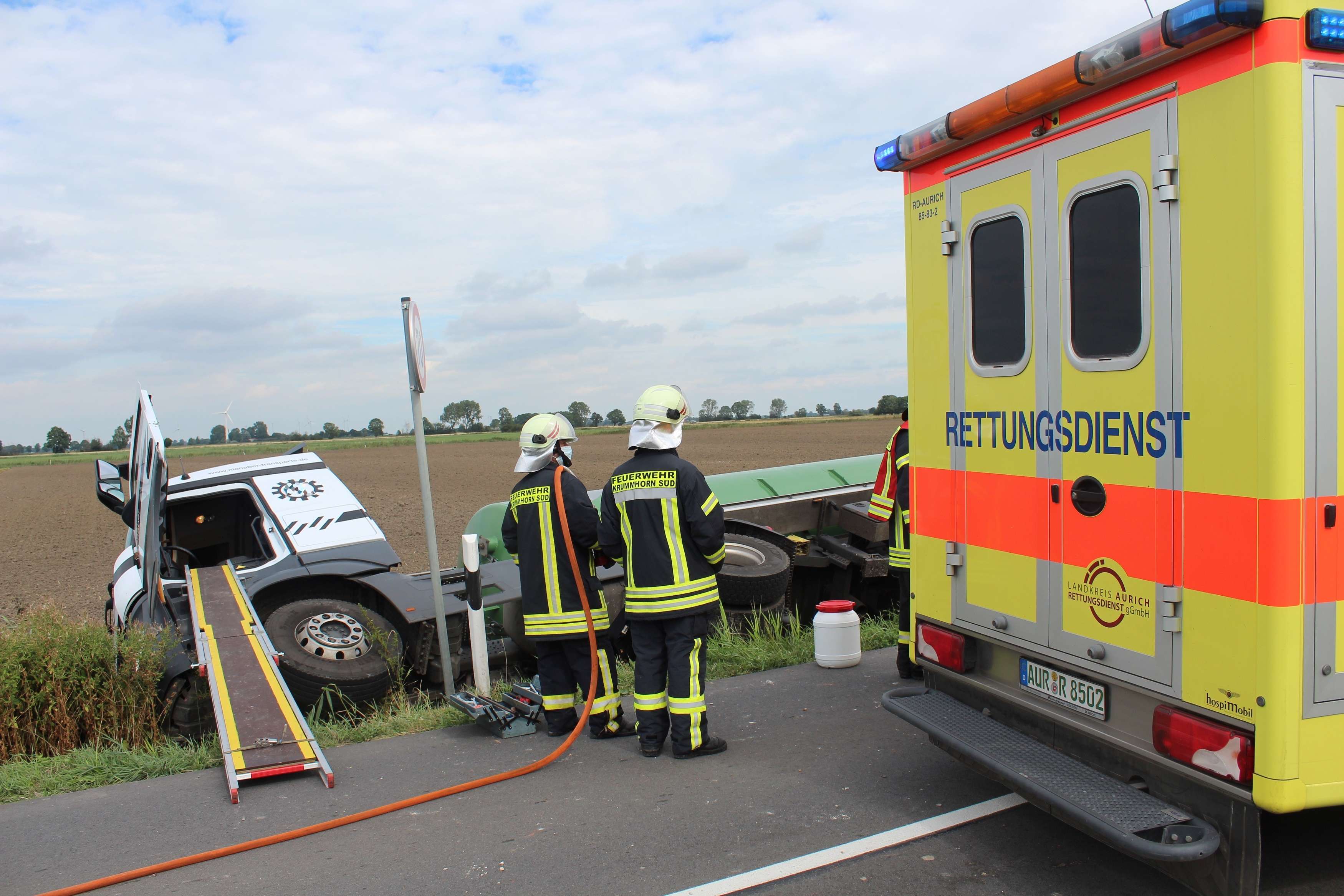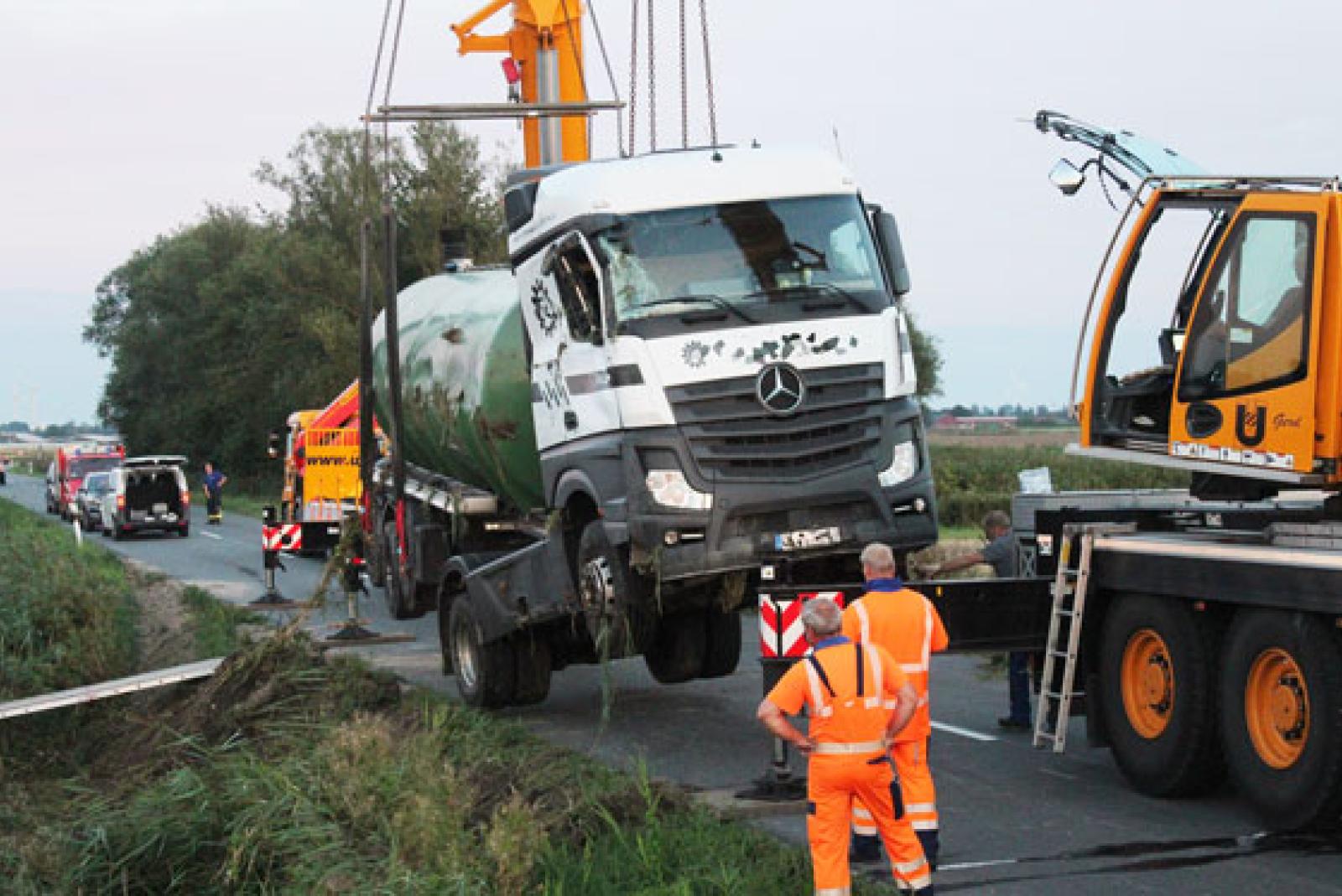 Ein mit Gülle beladener Tanklastzug ist am Donnerstagnachmittag auf der Landesstraße von Wybelsum in Fahrtrichtung Rysum in einem Graben verunglückt. Der Fahrer konnte mithilfe der Feuerwehr selbstständig aus dem Fahrerhaus herausklettern und wurde ins Krankenhaus gebracht.