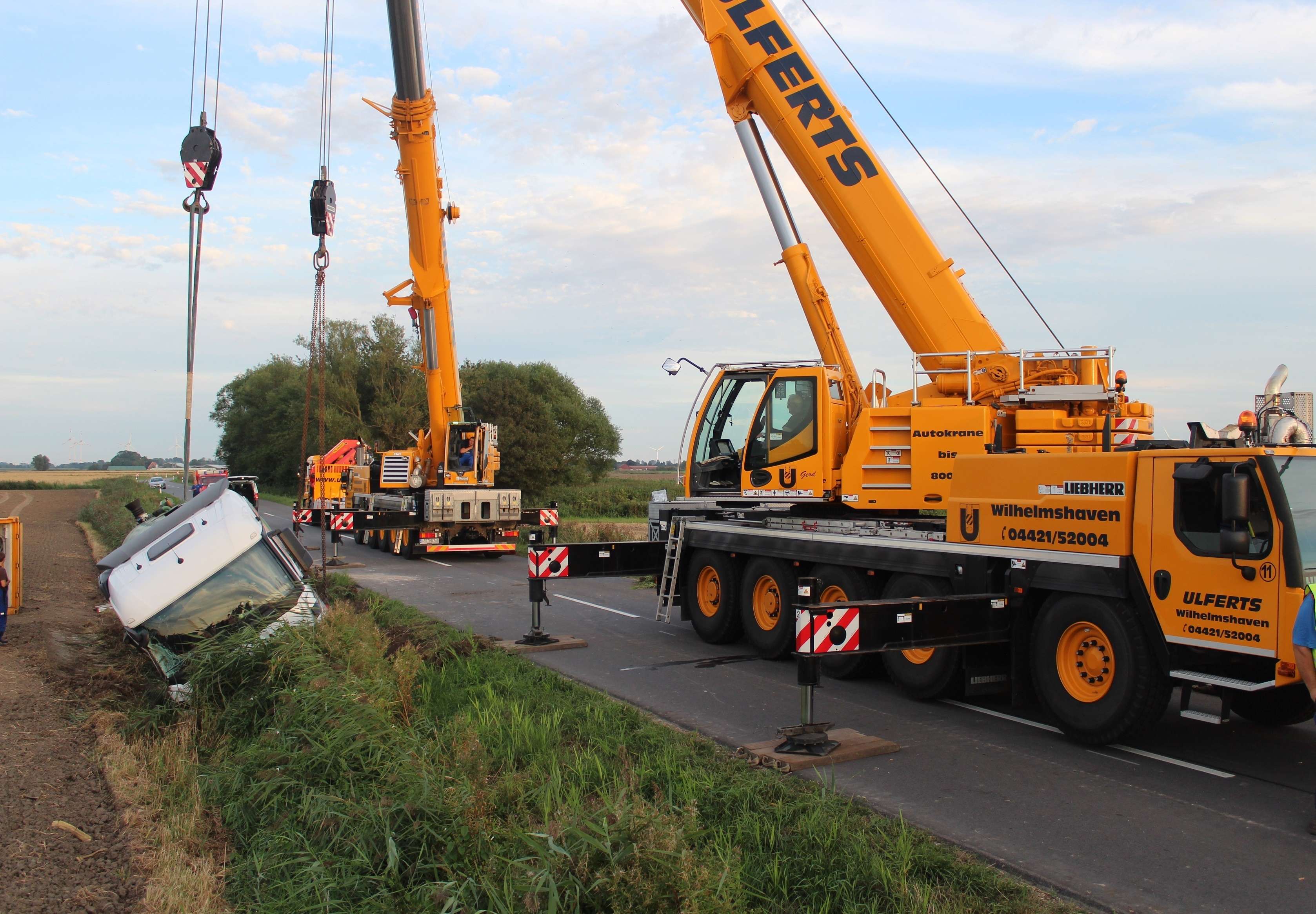 Die Feuerwehrkräfte streuten im Anschluss eine kleinere Menge ausgelaufener Betriebsstoffe mit Bindemittel ab. Nach insgesamt sieben Stunden konnte die Feuerwehr den Einsatz beenden. Im Einsatz waren 45 Einsatzkräfte mit neun Fahrzeugen. Des Weiteren waren die Polizei, die Untere Wasserbehörde des Landkreises Aurich und der Straßenbaulastträger vor Ort.