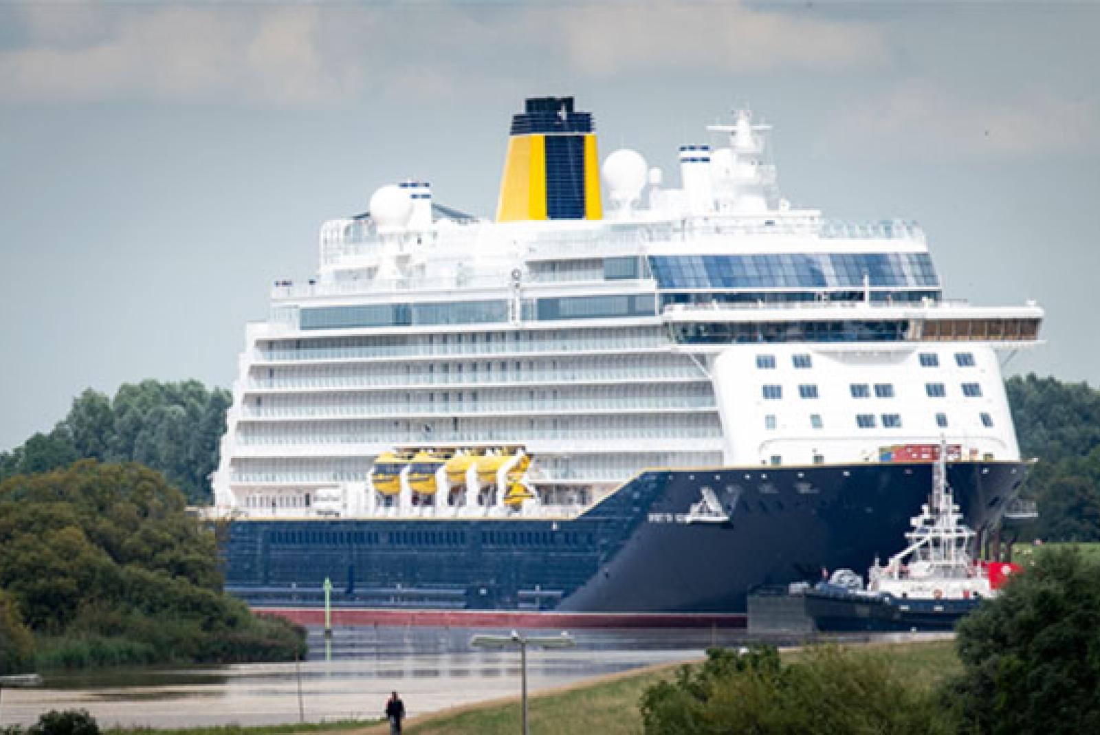 Die Ems-Überführung der »Spirit of Adventure« verlief bis zum Sonntagabend gegen 19.30 Uhr planmäßig. Wie im Zeitplan vorgesehen, passierte das neue Kreuzfahrtschiff der Papenburger Meyer Werft gegen 19 Uhr die Jann-Berghaus-Brücke in Bingum.