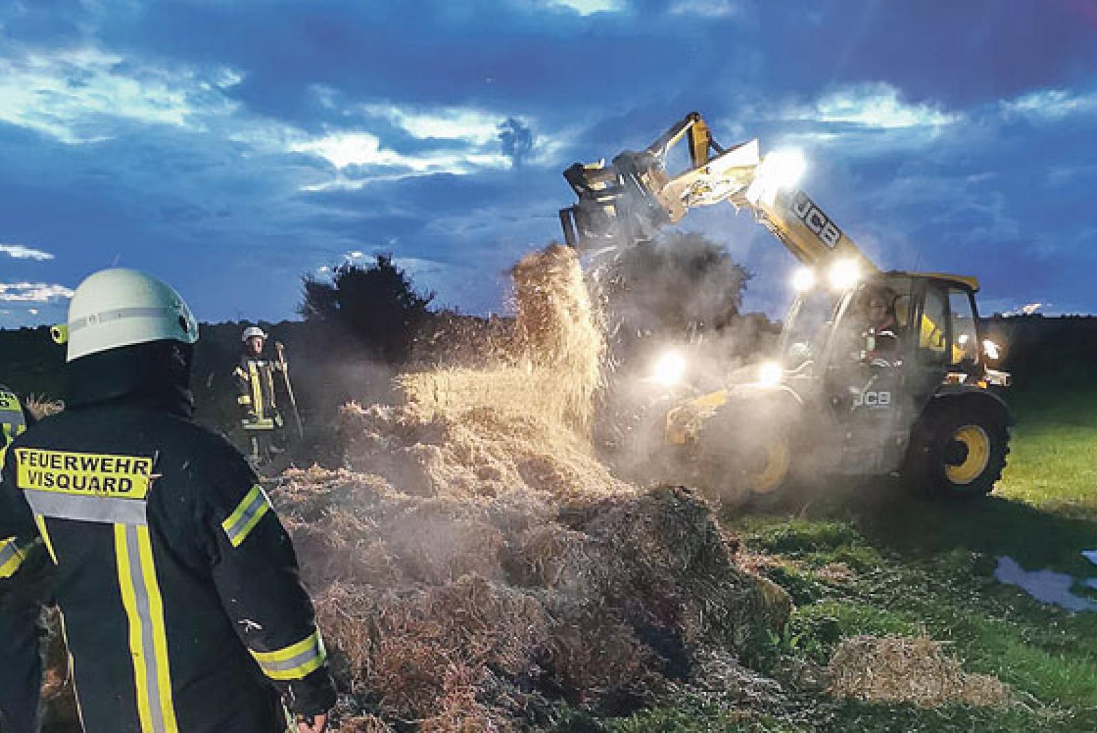 Nachdem die 60 Quaderballen ausgefahren wurden, konnten die meisten Einsatzkräfte den Einsatz beenden. Die Ortsfeuerwehr Visquard blieb noch vor Ort und zog einige der Ballen auseinander. Auf Grund der hohen Innentemperatur von 80 Grad Celsius dampften diese bereits.