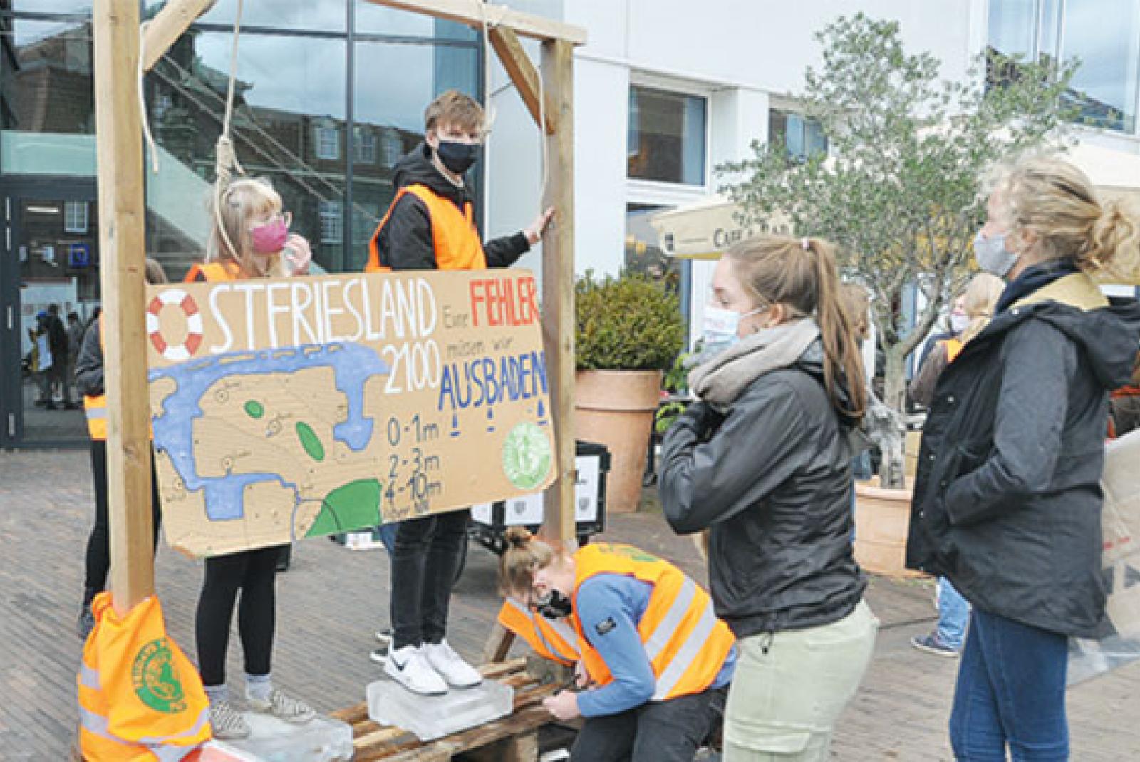 Die Leeraner Ortsgruppe der Klimabewegung »Fridays for Future« hat kürzlich auf dem Denkmalsplatz in Leer eine Mahnwache unter dem Motto »#KeinGradWeiter« abgehalten. »Dabei stellten wir einen Galgen auf, während Eisblöcke langsam aber sicher unter den Füß...