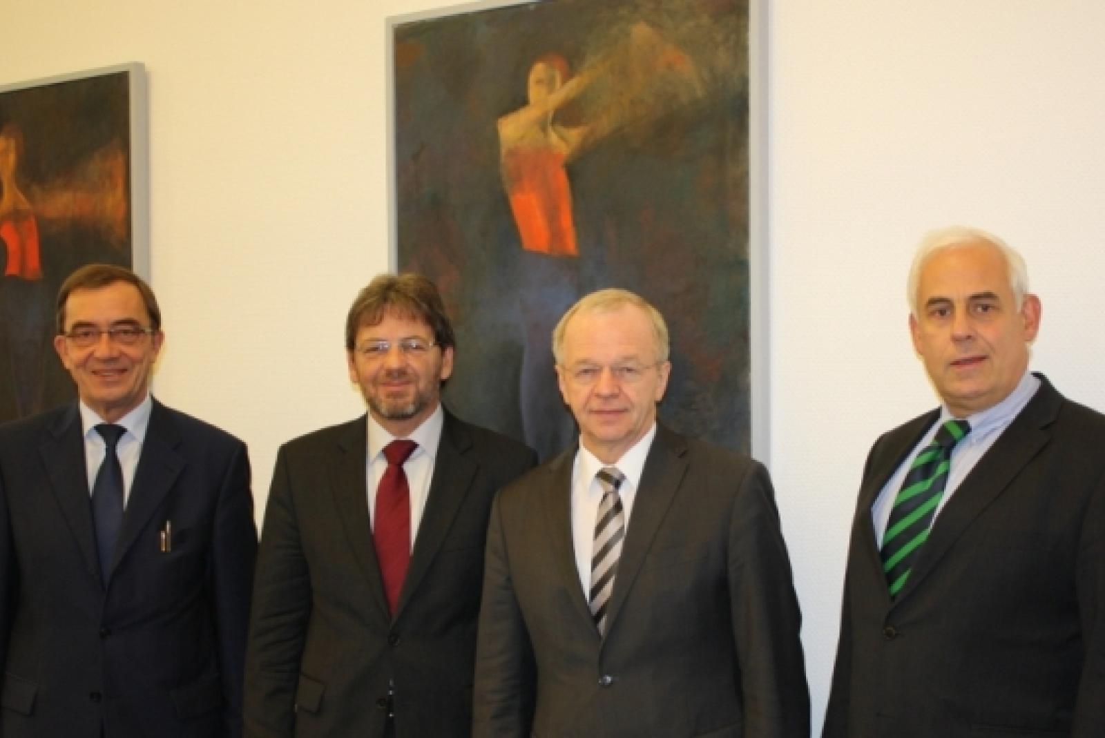 Der SPD-Bundestagsabgeordnete Markus Paschke (2. von links) diskutierte bei seinem Antrittsbesuch im Kreishaus in Leer mit Landrat Bernhard Bramlage (2. von rechts), dem Ersten Kreisrat Rüdiger Reske (links) und Wirtschaftsförderer Harald Krebs (rechts). © Foto: privat