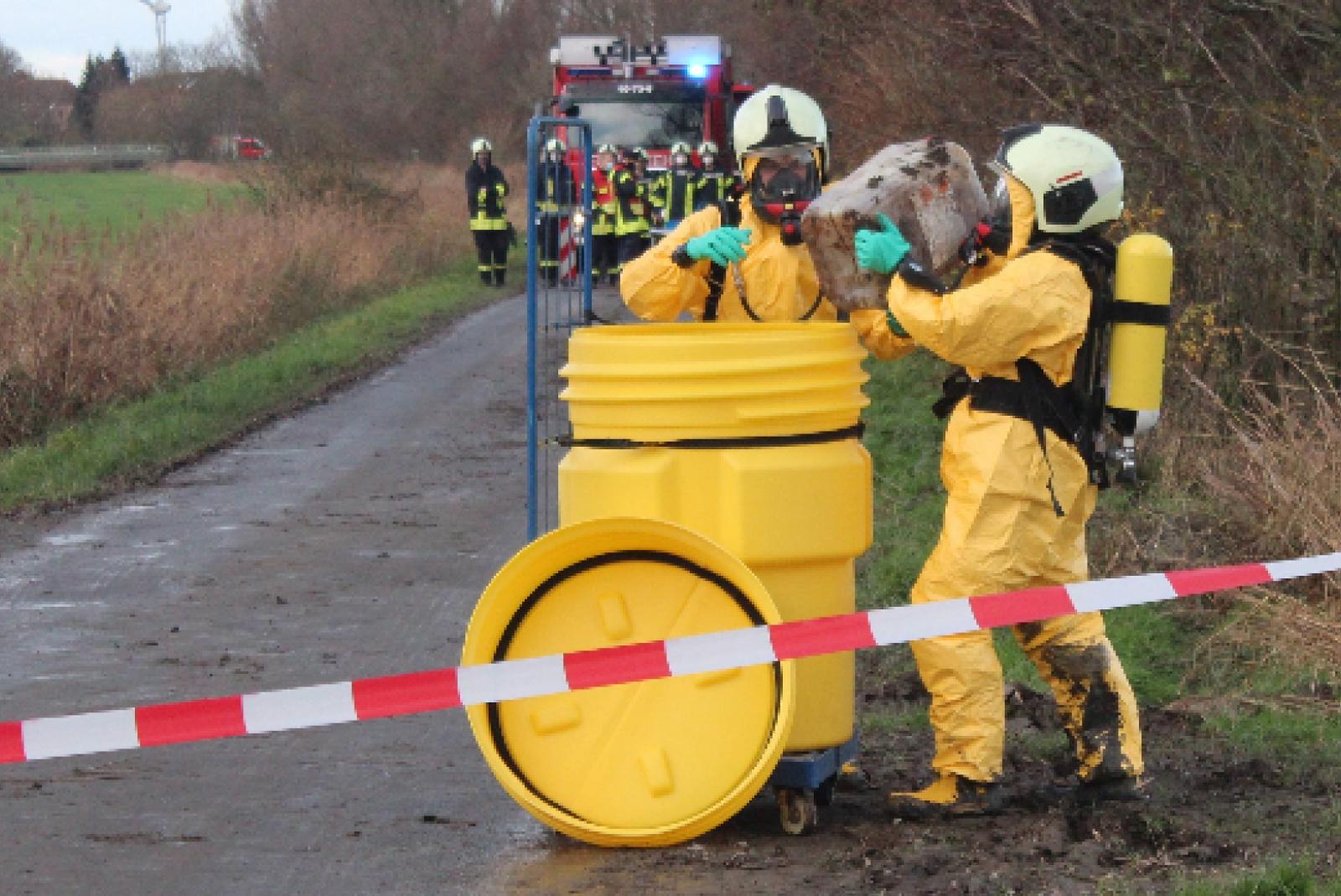 Nachdem ein Landwirt das Gefahrgut am Donnerstag gegen 8 Uhr entdeckte, kam es zu einem Großeinsatz der Feuerwehr. Denn ein Mitarbeiter der Unteren Wasserbehörde des Landkreises Aurich bemerkte beim Öffnen eines Kanisters ein ungewöhnliches Geräusch, das sich nach einer chemischen Reaktion anhörte. Daraufhin begab er sich in sichere Entfernung und zog die Feuerwehr hinzu.