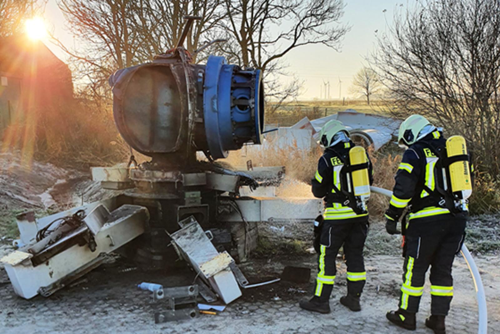 Das demontierte Teil einer Windenergienalage brannte am Sonntagmorgen in Nesse (Landkreis Aurich). Die Feuerwehr Nesse wurde um 9.21 Uhr alarmiert. Vor Ort stellten die Einsatzkräfte festgestellt, dass es sich um ein am Vortag demontiertes Teil einer Windenergieanlage handelte, welches in Brand geraten war. Unter Atemschutzgerät wurde der Brand innerhalb weniger Minuten gelöscht.