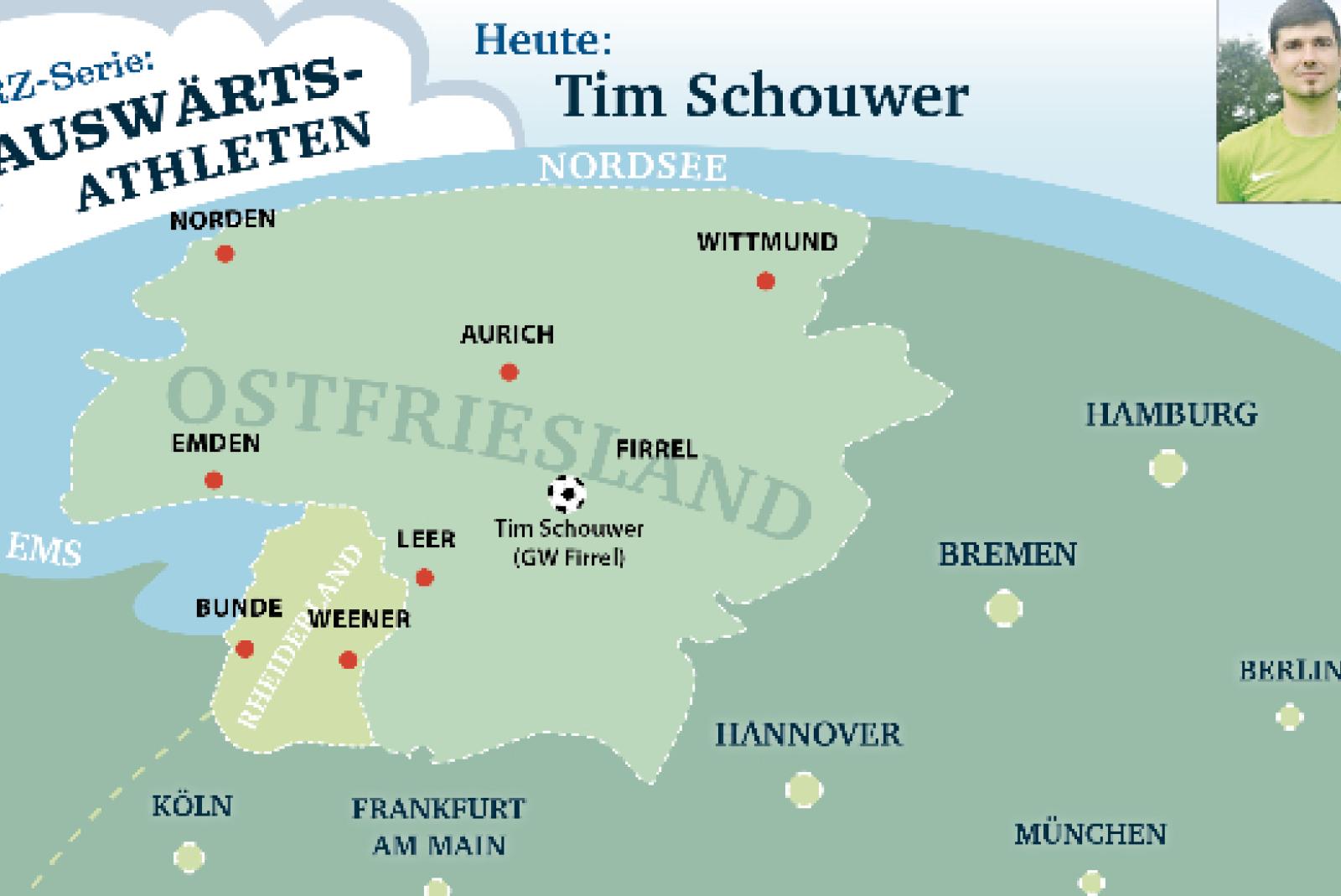 In der Serie »Auswärtsathleten« stellt die RZ wöchentlich einen Sportler aus dem Rheiderland vor, der außerhalb des Rheiderlands aktiv sind. In Teil 1 geht es um Tim Schouwer von Fußball-Landesligist Grün-Weiß Firrel.