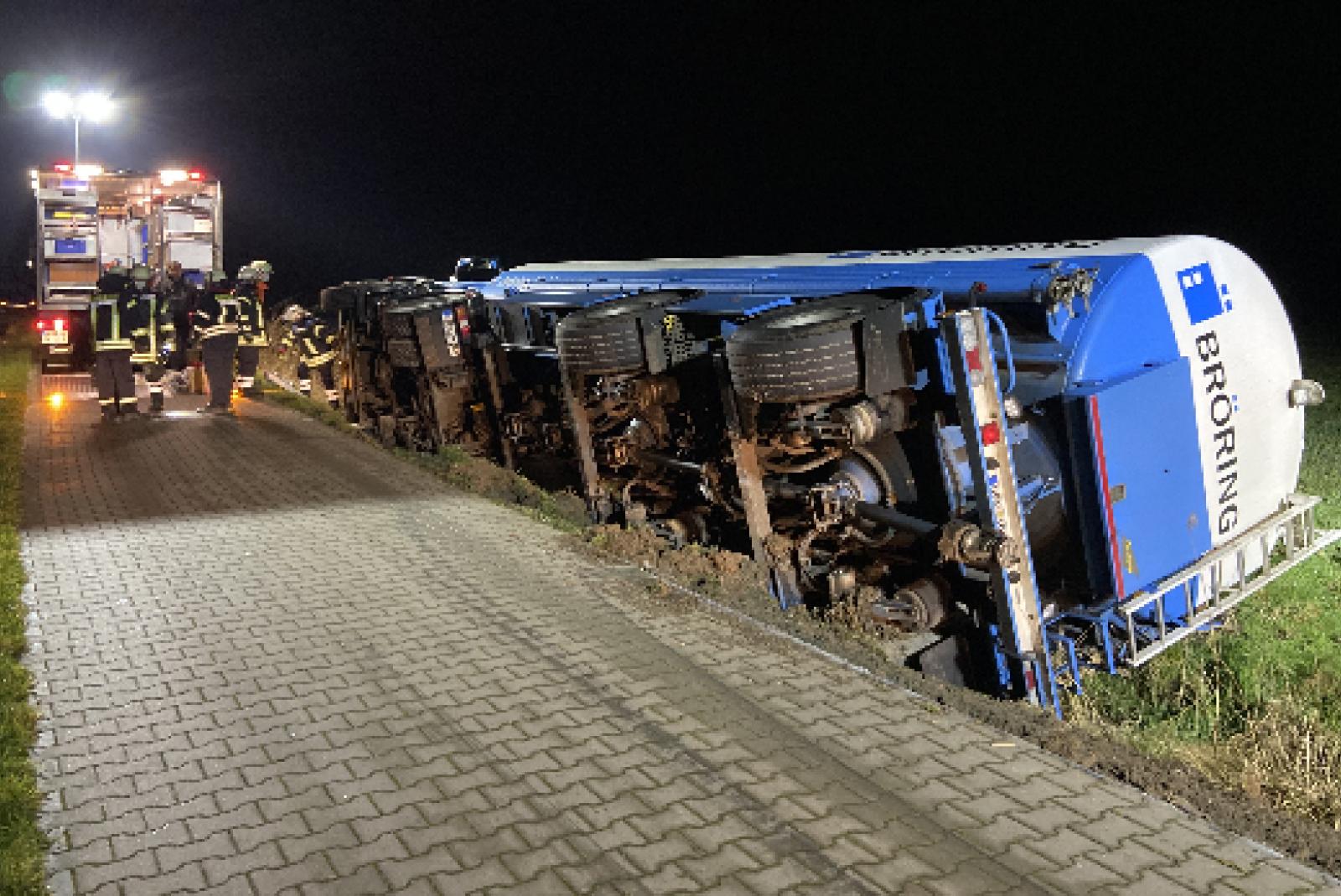 Ein mit etwa 20 Tonnen Tierfuttermitteln beladener Sattelzug ist am Montagabend am Uttumer Weg in Canhusen in der Gemeinde Hinte (Kreis Aurich) von der Fahrbahn abgekommen und umgekippt. Der Lkw-Fahrer kam mit dem Schrecken davon, er blieb unverletzt.