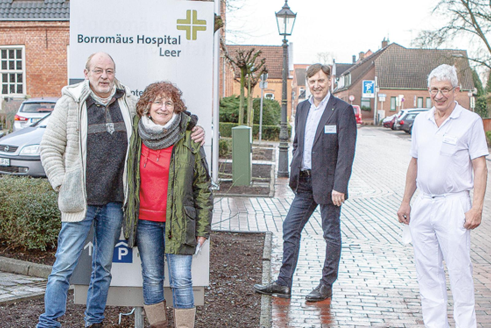 Ein Dankeschön für die Mitarbeitenden auf der Intensivstation des »Borros«: Kirsten und Ralf Borde von »Bücher Borde« in Leer (von links) übergaben Geschäftsführer Dieter Brünink und Dr. Dietrich Keller, Chefarzt der Anästhesie, ...