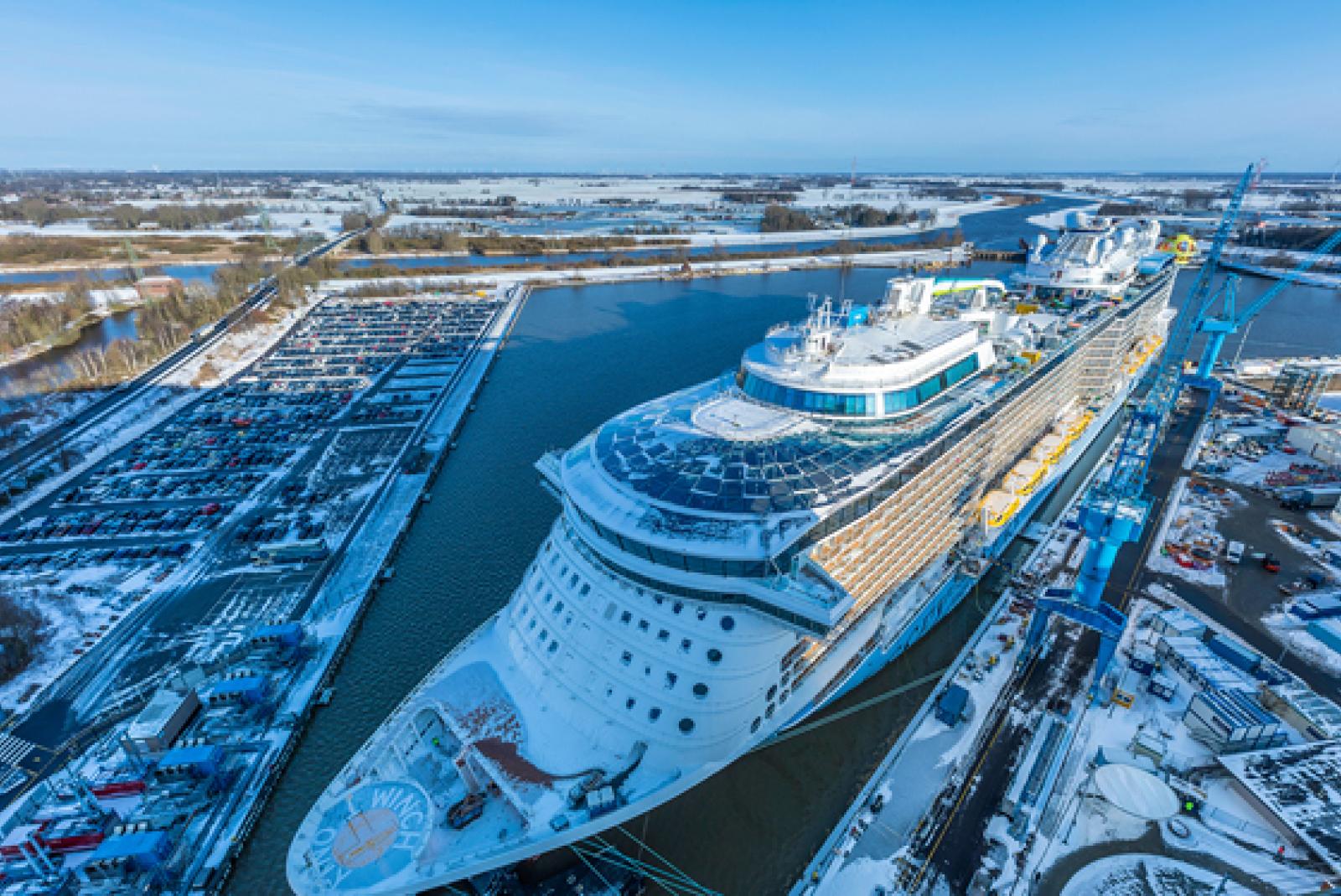 Das Kreuzfahrtschiff »Odyssey of the Seas »für die amerikanische Reederei Royal Caribbean International (Miami) wirdmorgen Papenburg verlassen und auf der Ems nach Eemshaven in den Niederlanden überführt. Das teilt die Meyer Werft mit.