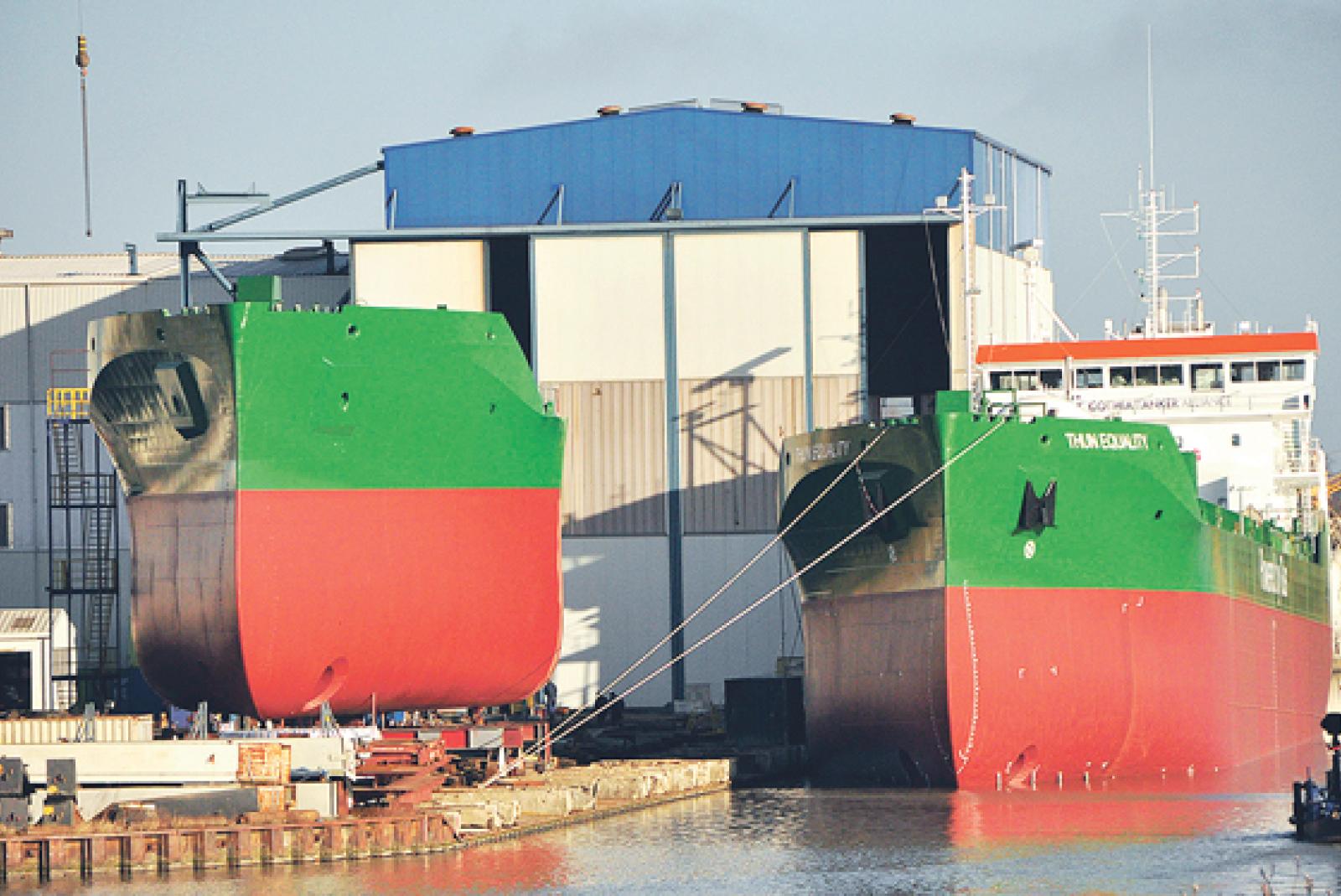 Während der Chemikalientanker »Thun Equality« gerade im Industriehafen von Leer bei der Ferus Smit-Werft am 19. Februar vom Stapel gelaufen ist, steht das Bugsegment des nächsten Chemikalien-Tankers bereits auf der Helling.