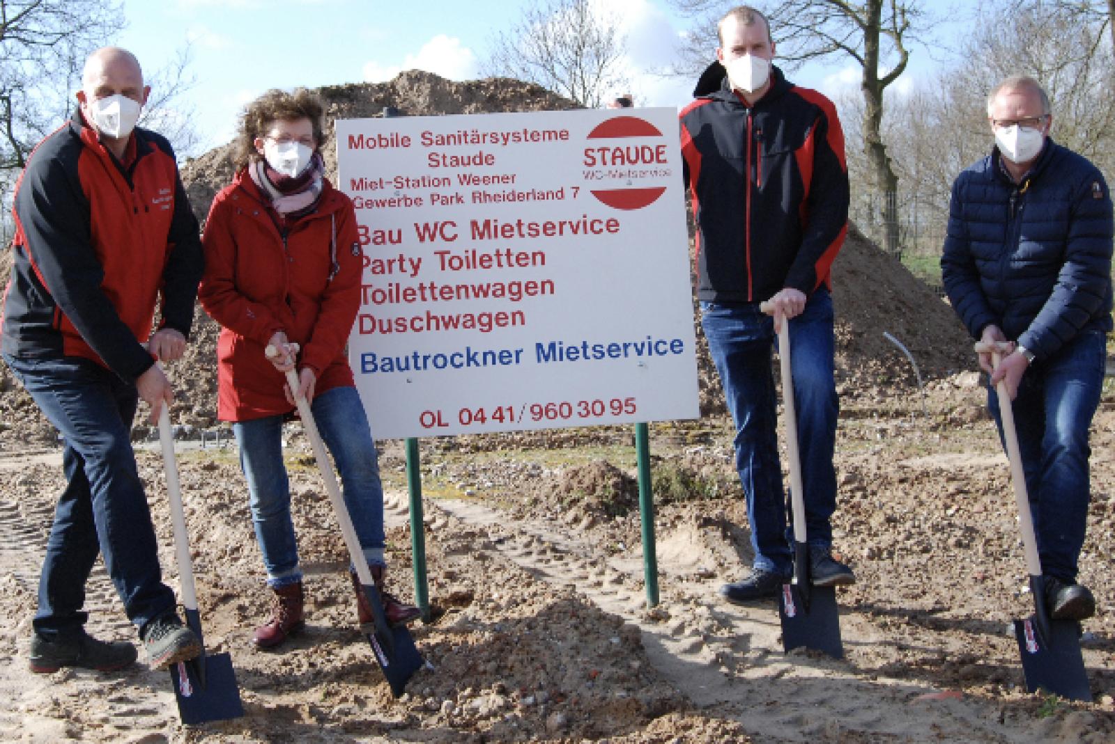 Zusammen mit seiner Frau Beate und seinem Sohn Nico griff Detlef Staude heute zum Spaten, es ging um den symbolischen ersten Spatenstich für die neue Zweigstelle des Familienunternehmens »Mobile Sanitätssysteme Staude« im GewerbePark Rheiderland in Stapelmoorerheide.