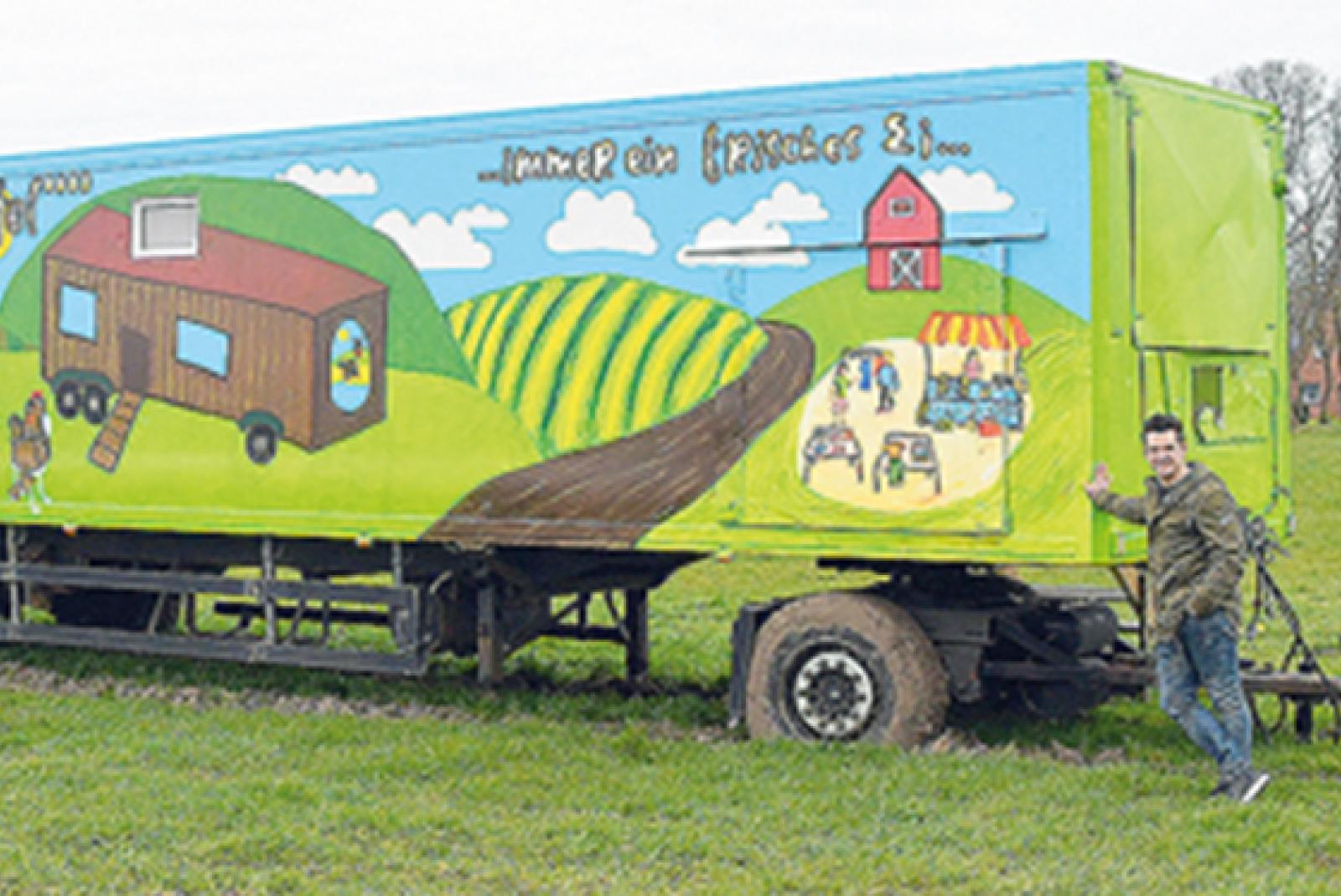 Ein bunt bemalter und zu einem Hühnerstall umgebauter Lkw-Kühlauflieger mit dem Slogan »Simonswolder Hühnerhotel – immer ein frisches Ei« zieht seit einigen Wochen die Blicke der Menschen, die tagtäglich an ihm vorbeifahren, auf sich, ob man will ...