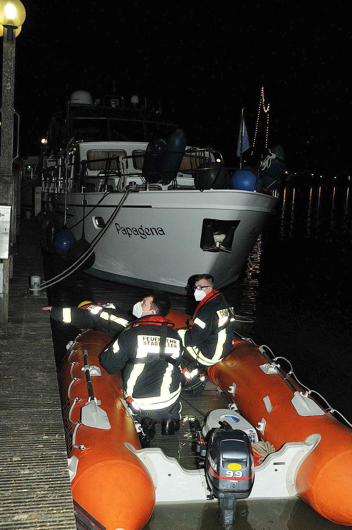 Jugendliche, die am Hafen angelten, hörten die Rufe des Tieres und alarmierten um 23 Uhr die Feuerwehr. Die Einsatzkräfte schraubten eine Bohle der Uferpromenade ab und konnten das Tier so befreien. Die Katze, die unverletzt war, verschwand in der Dunkelheit.