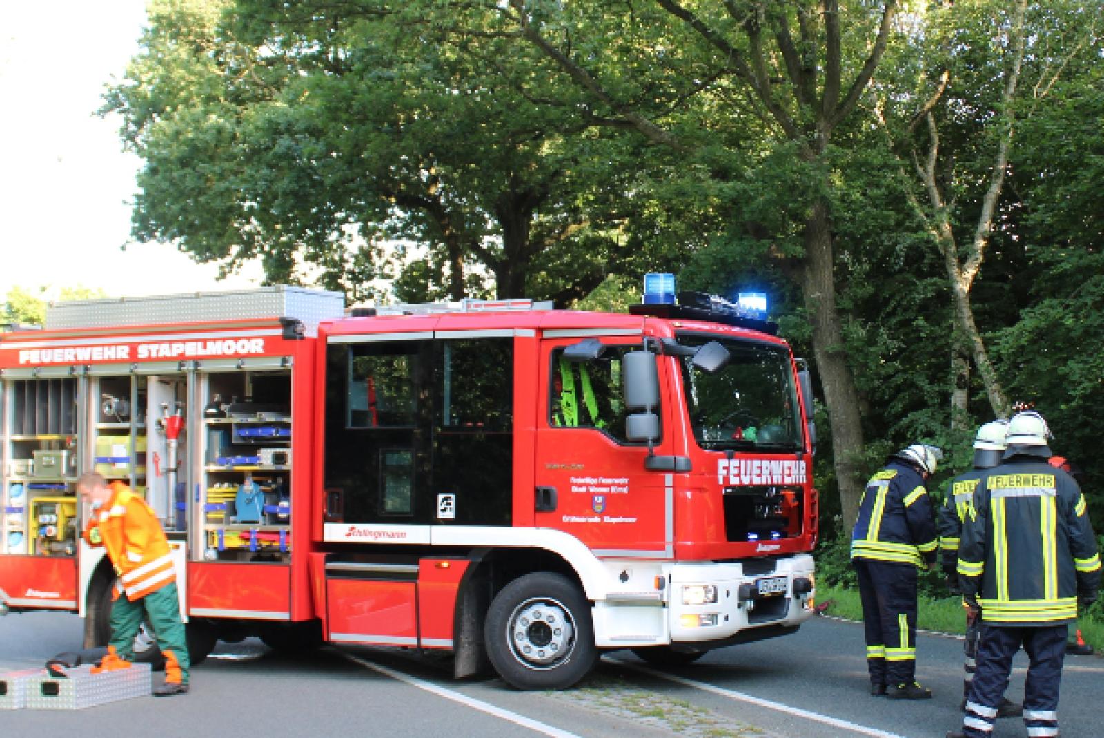 Die Feuerwehr Stapelmoor wurde heute um 18.21 Uhr zu einem Hilfeleistungseinsatz mit dem Stichwort „Baum droht auf Straße zu fallen“ alarmiert. An der Rheiderlandstraße, der Kreisstraße 27, drohte kurz nach dem Kreisel in Stapelmoorerheide ein Baum auf die Fahrbahn fallen. Die Einsatzkräfte setzten die Motorsäge ein, um den Baum zu fällen und somit die Gefahrenquelle zu beseitigen. Die Rheiderlandstraße musste während des Einsatzes kurzeitig voll gesperrt werden. Die Feuerwehr Stapelmoor war mit dem Hilfeleistungslöschgruppenfahrzeug HLF 10 und neun Einsatzkräften vor Ort.