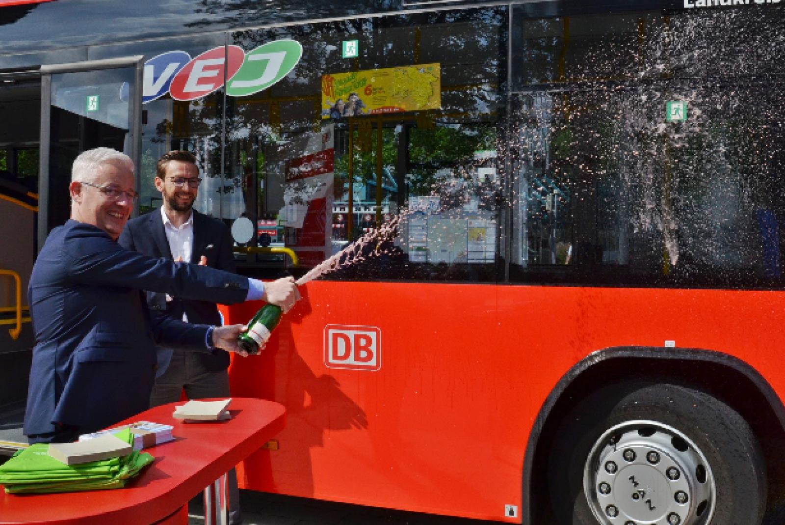 Landrat Matthias Groote taufte am Donnerstagnachmittag gemeinsam mit dem Geschäftsführer der Weser-Ems Busverkehr GmbH, Daniel Marx, auf dem Vorplatz des Leeraner Zollhauses einen der sechs neuen Busse auf den Namen "Landkreis Leer“ und stellten diesen vor: "Mit der ...