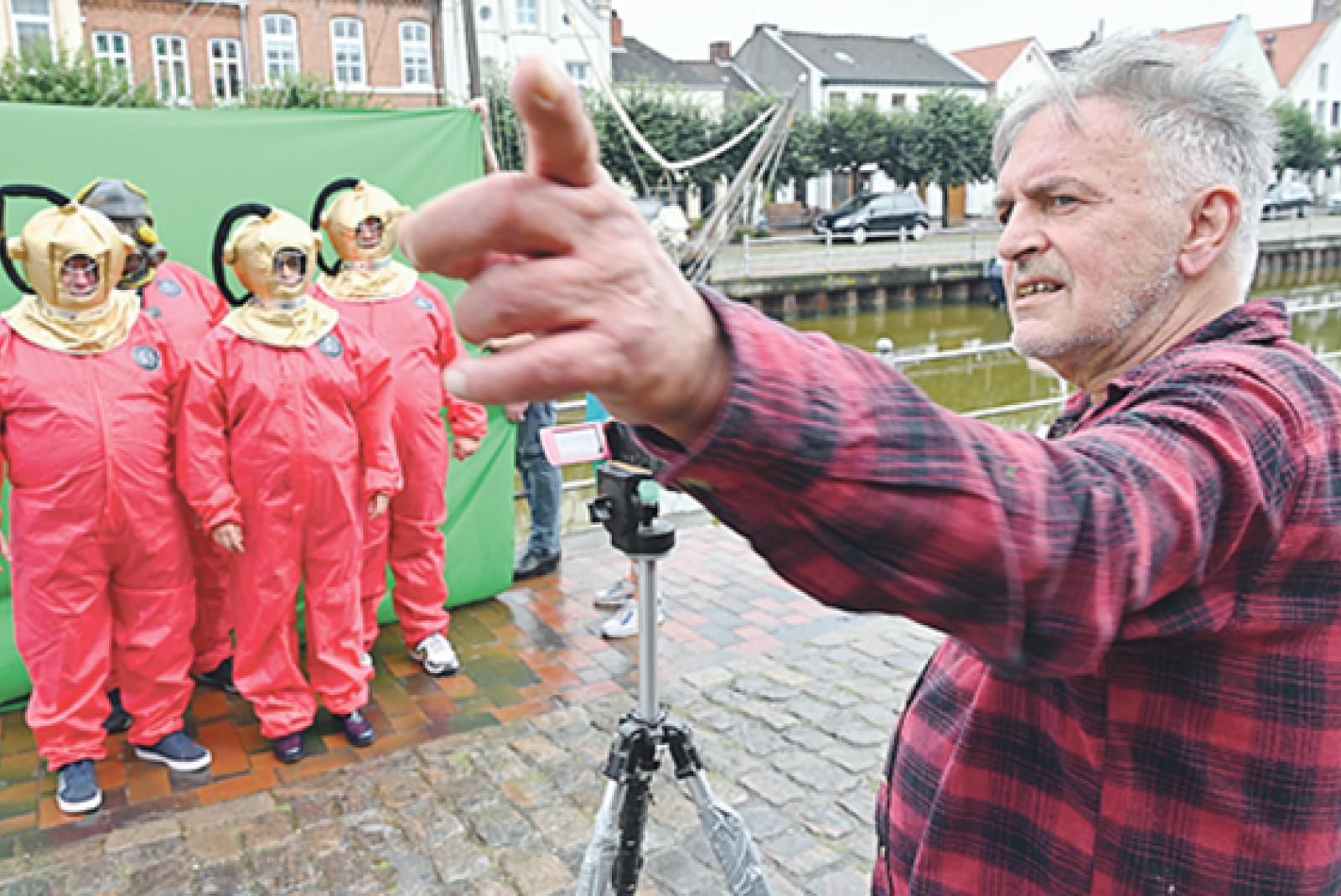 Dreharbeiten im Hafen in Weener: Timo Winterboer, Heinz Smeenge und Christian Mettin haben sich in Taucheranzüge gezwängt. Wolfgang Arends, er steht auch hinter der Kamera, gibt letzte Anweisungen. Und die große grüne Leinwand ist für ...