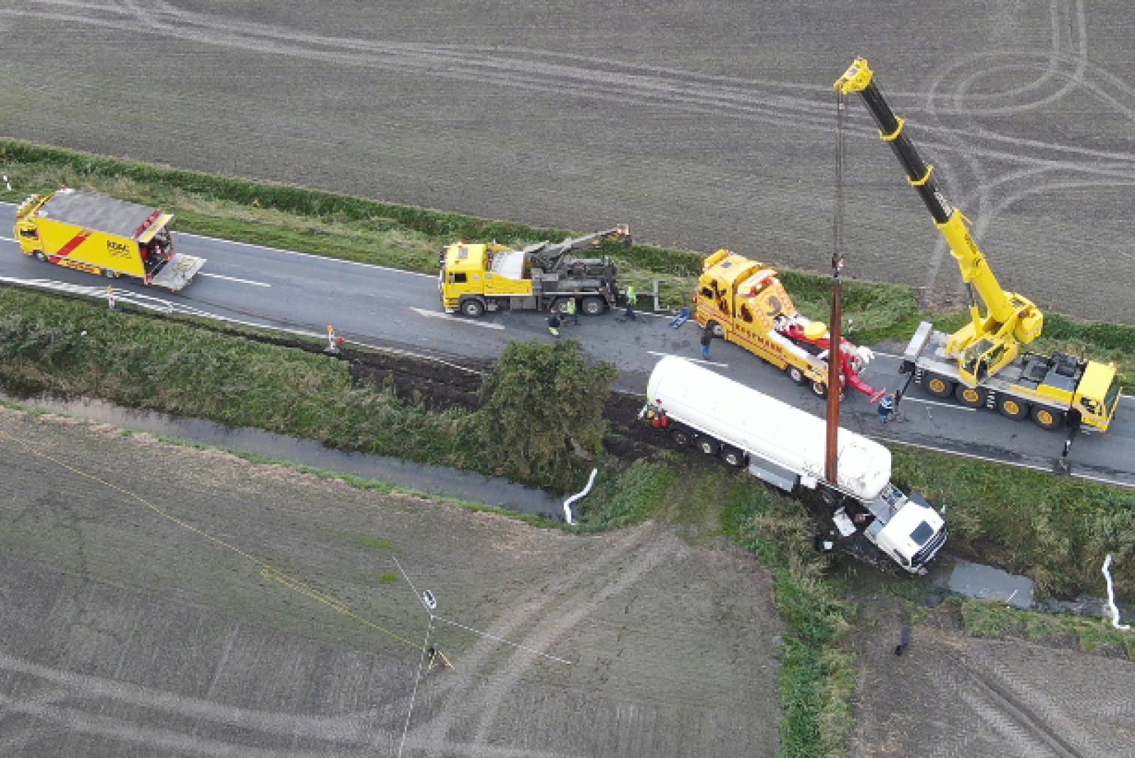 Gegen 16 Uhr traf ein Bergungsunternehmen ein, um den Lkw mit einem Kran aus dem Graben zu hieven. Die Bergung wurde mit den Drohnen der Feuerwehren Osterhusen und Norden aus der Luft überwacht. Nach gut drei Stunden stand der Lkw ohne Zwischenfälle wieder auf der Straße und wurde von einem Abschleppunternehmen in eine Werkstatt gebracht.