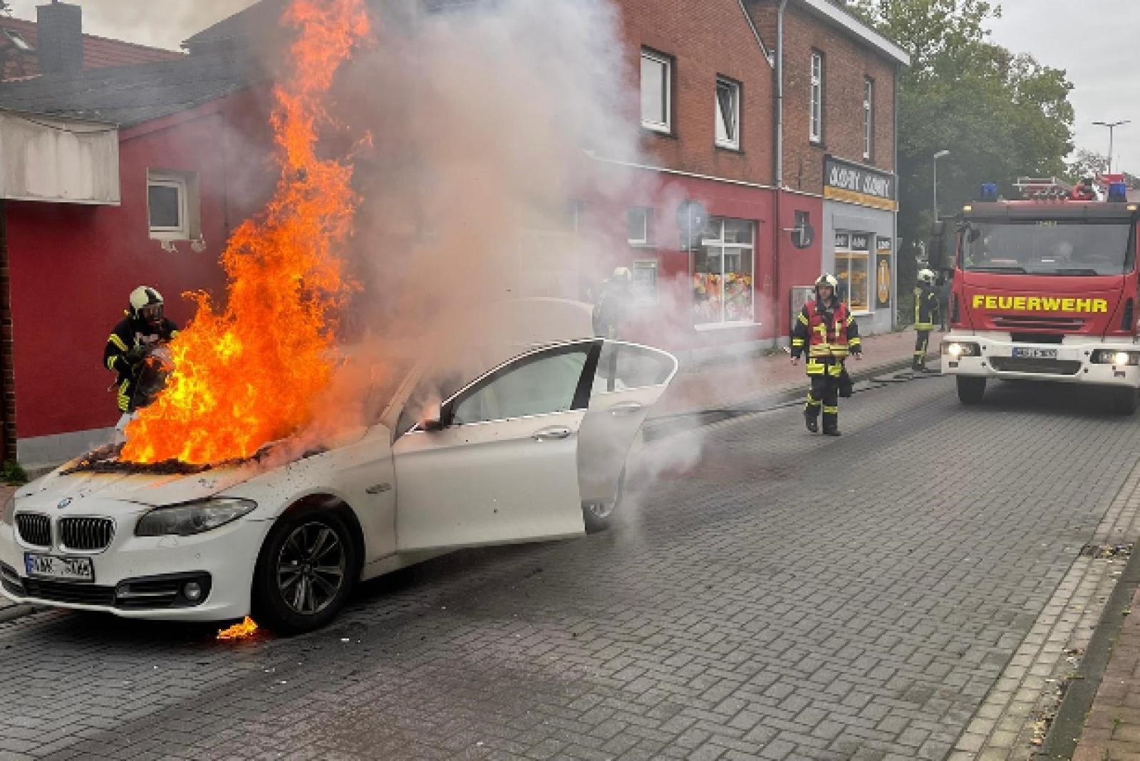 Die Feuerwehr Aurich ist am Samstagvormittag zu einem Fahrzeugbrand in den Breiten Weg in Aurich alarmiert worden. Vor Ort fanden die Einsatzkräfte einen Wagen vor, dessen Motorraum bereits in Vollbrand stand.