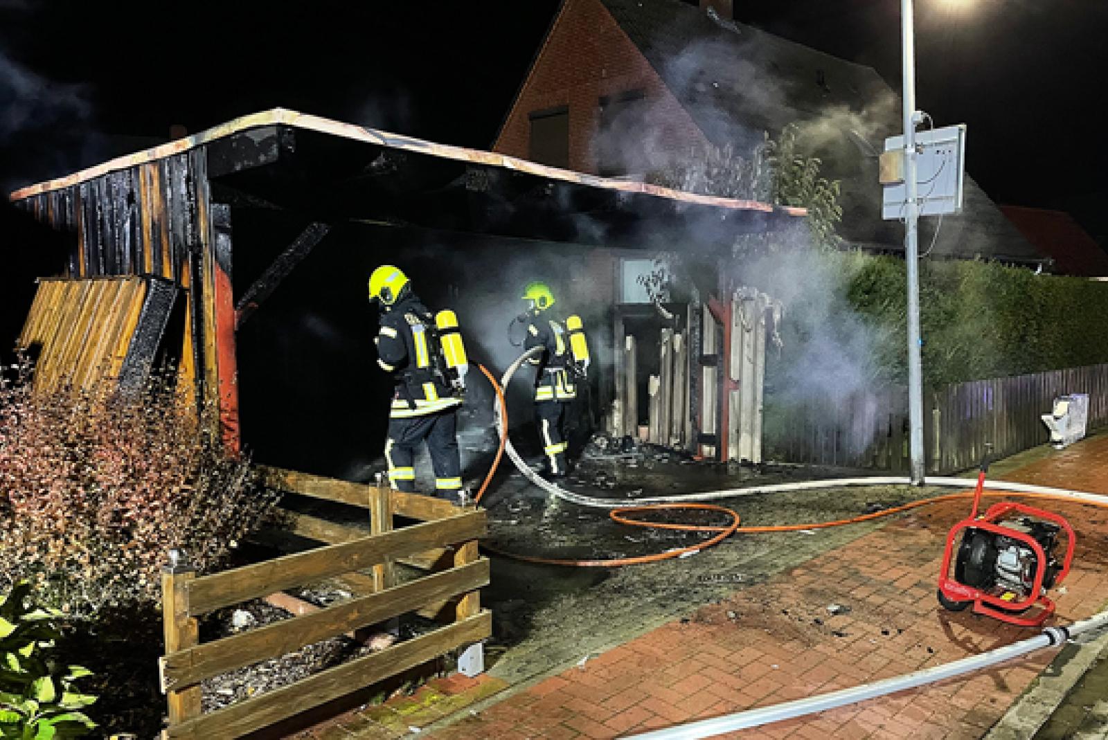 In der Nacht zum Sonntag wurden die Einsatzkräfte der Feuerwehren Wirdum, Upgant-Schott und Osteel um 1.36 Uhr zu einem Garagenbrand in der Dorfstraße in Wirdum alarmiert. Dort war aus bisher ungeklärter Ursache ein direkt an der Straße befindlicher leer stehendender Carport in Brand geraten. Ein Anwohner hatte das Feuer bemerkt und die Feuerwehr über die Kooperative Leitstelle Ostfriesland alarmiert. Mittels Schnellangriff und auf dem Fahrzeug mitgeführtem Löschwasser konnte ein unter Atemschutz eingesetzter Trupp sofort mit den Löscharbeiten beginnen. Dank umgehend aufgebauter Wasserversorgung und dem Einsatz eines zweiten Angriffstrupp konnte das Feuer schnell unter Kontrolle und eine Ausbreitung durch Kühlung der nebenstehenden Wohnhäuser verhindert werden, so die Feuerwehr.