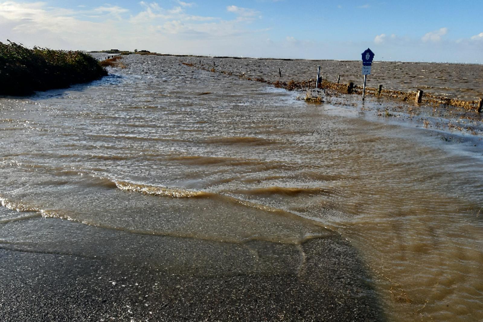 Land unter in Dyksterhusen: Hochwasser und der viele Regen, den das Sturmtief "Ignatz" in den vergangenen Tagen brachte, sorgte dafür, dass der Weg zur Bohrinsel überschwemmt wurde, wie das Leserfoto von Thekla Pott eindrücklich zeigt. Währenddessen hat das Sturmtief, das in weiten Teilen Deutschlands seit Mittwoch große Schäden anrichtete, in Ostfriesland für nur wenige Schäden gesorgt. So sind zum Beispiel die Feuerwehren des Landkreises Aurich von Mittwochabend bis Freitagnachmittag insgesamt nur zu vier Sturmschäden alarmiert worden.