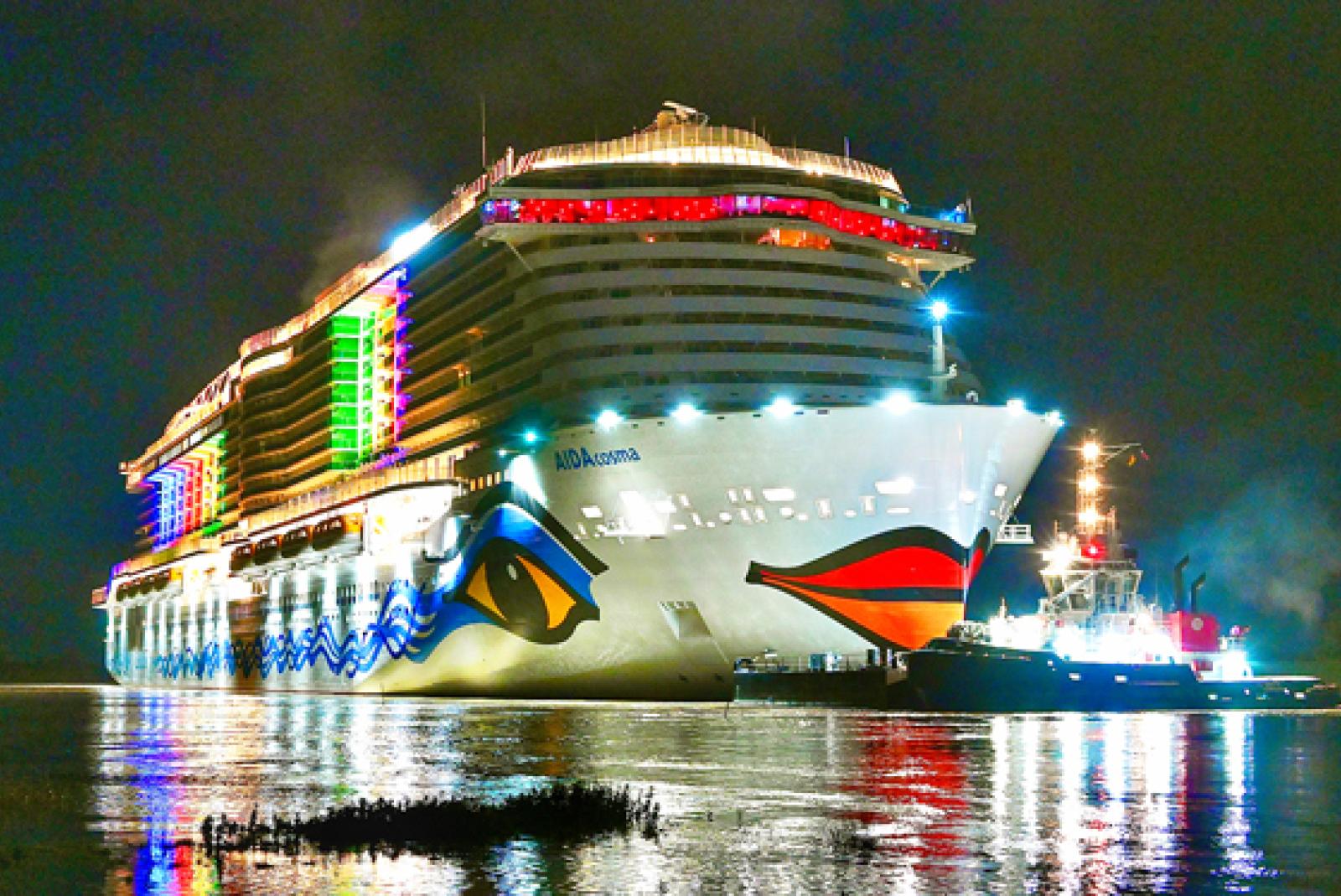 Die »Aida Cosma« ist auf ihrem Weg zur Nordsee am Emssperrwerk bei Gandersum angekommen. Die Überführung nach Eemshaven (NL) liegt dabei weit vor dem ursprünglichen Zeitplan. So begann die Überfahrt in der vergangenen Nacht rund eine halbe Stunde ...