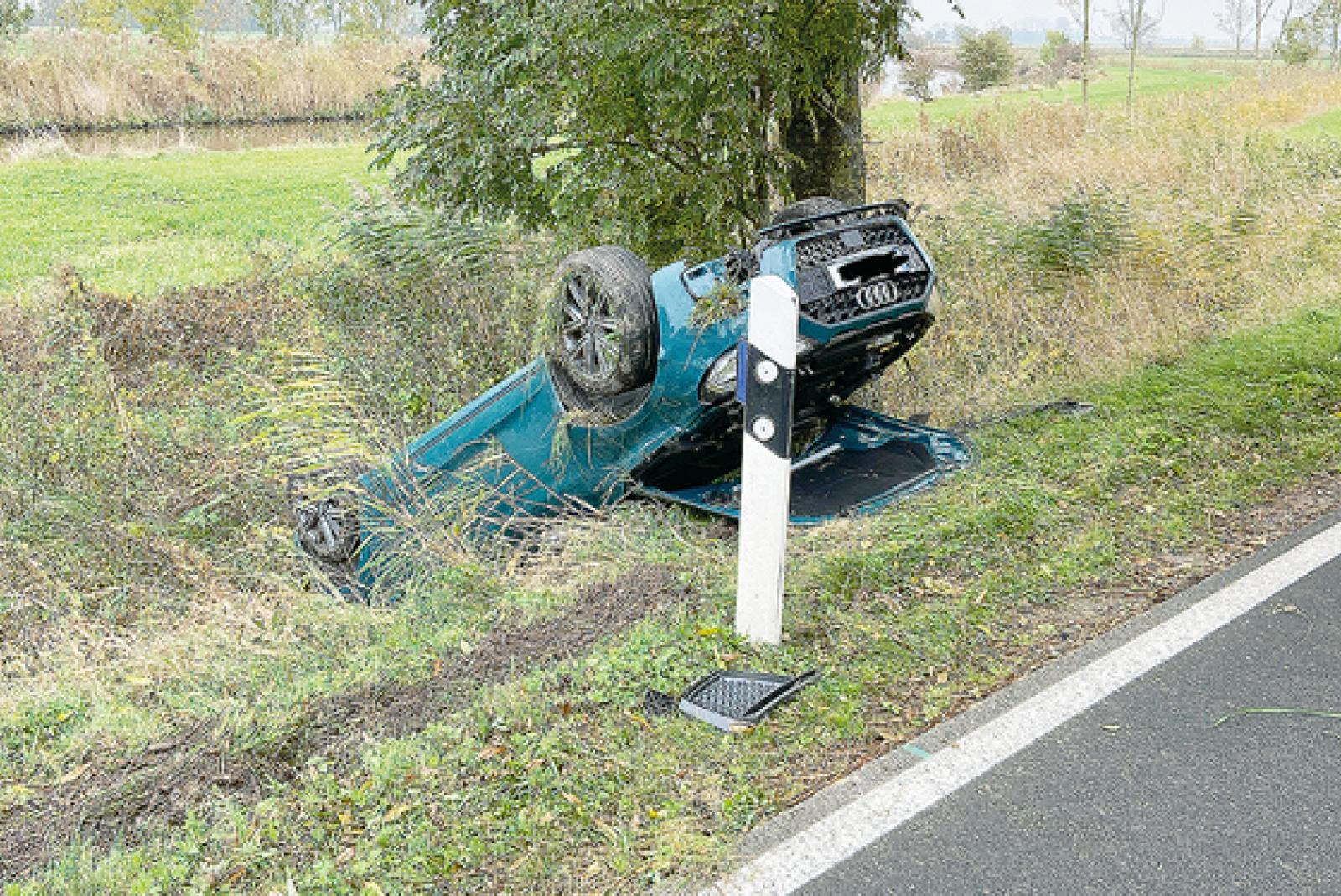 Die Frau war mit ihrem Audi von der Fahrbahn abgekommen, der Wagen blieb kopfüber in einem Graben liegen. Glück im Unglück: Der Wagen verfehlte dabei nur knapp einen Baum.
