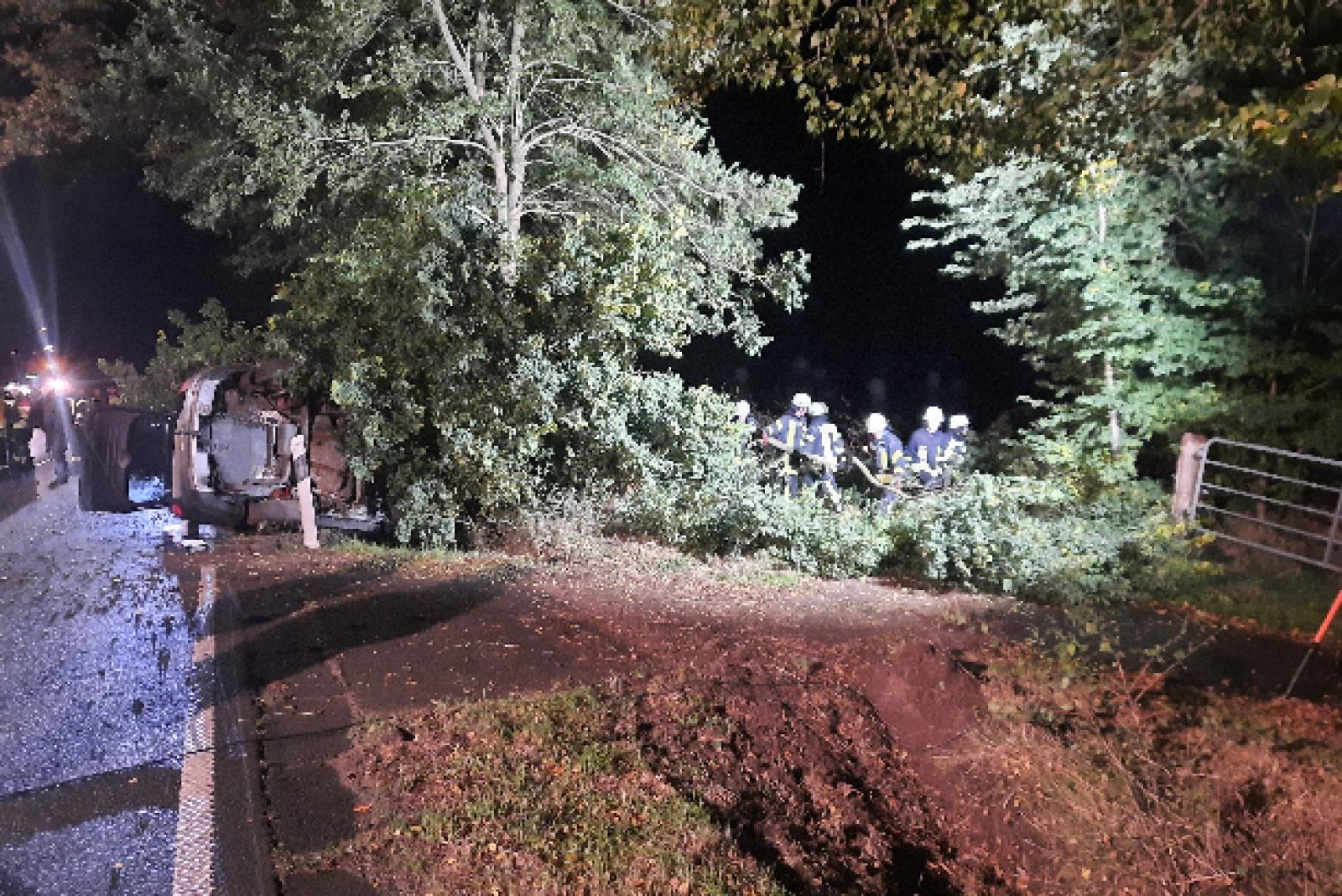 Aus bislang ungeklärter Ursache war der Fahrer gegen 21 Uhr mit seinem Wagen von der Bundesstraße abgekommen und mit mehreren Bäumen kollidiert. Nach etwa 100 Metern kam das Fahrzeug auf der Seite liegend im Graben zum Stehen.