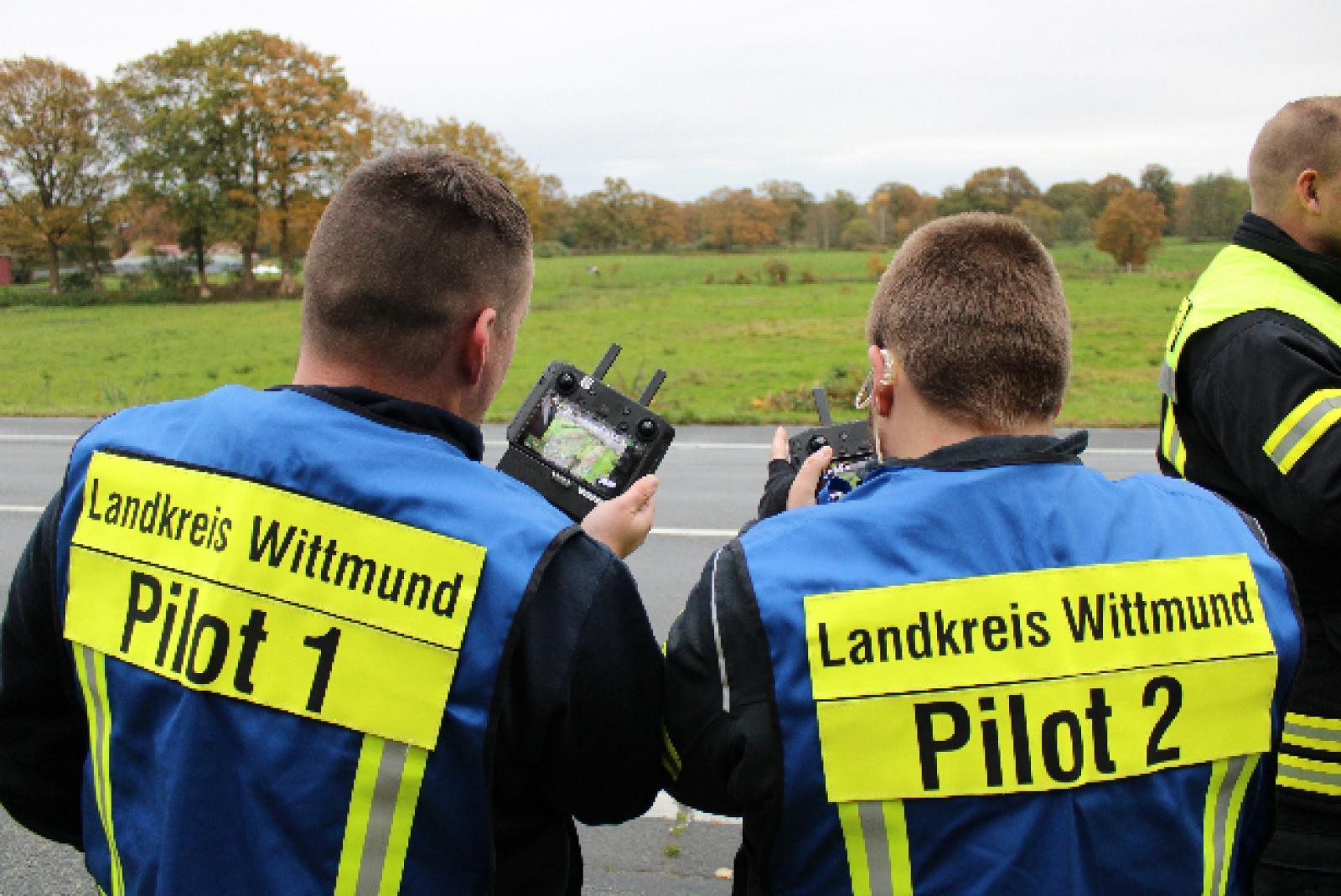 Mehrere Drohneneinheiten aus den ostfriesischen Landkreisen Aurich, Leer, Wittmund und der kreisfreien Stadt Emden, die DRK-Bereitschaft Aurich, sowie die DRV-Rettungshundestaffel Ems-Jade aus dem benachbarten Landkreis Friesland sind am Samstagnachmittag auf dem Gelände des Gründerzentrums in Wiesederfehn zusammen gekommen, um das gemeinsame Vorgehen bei einer groß angelegten Personensuche zu trainieren.