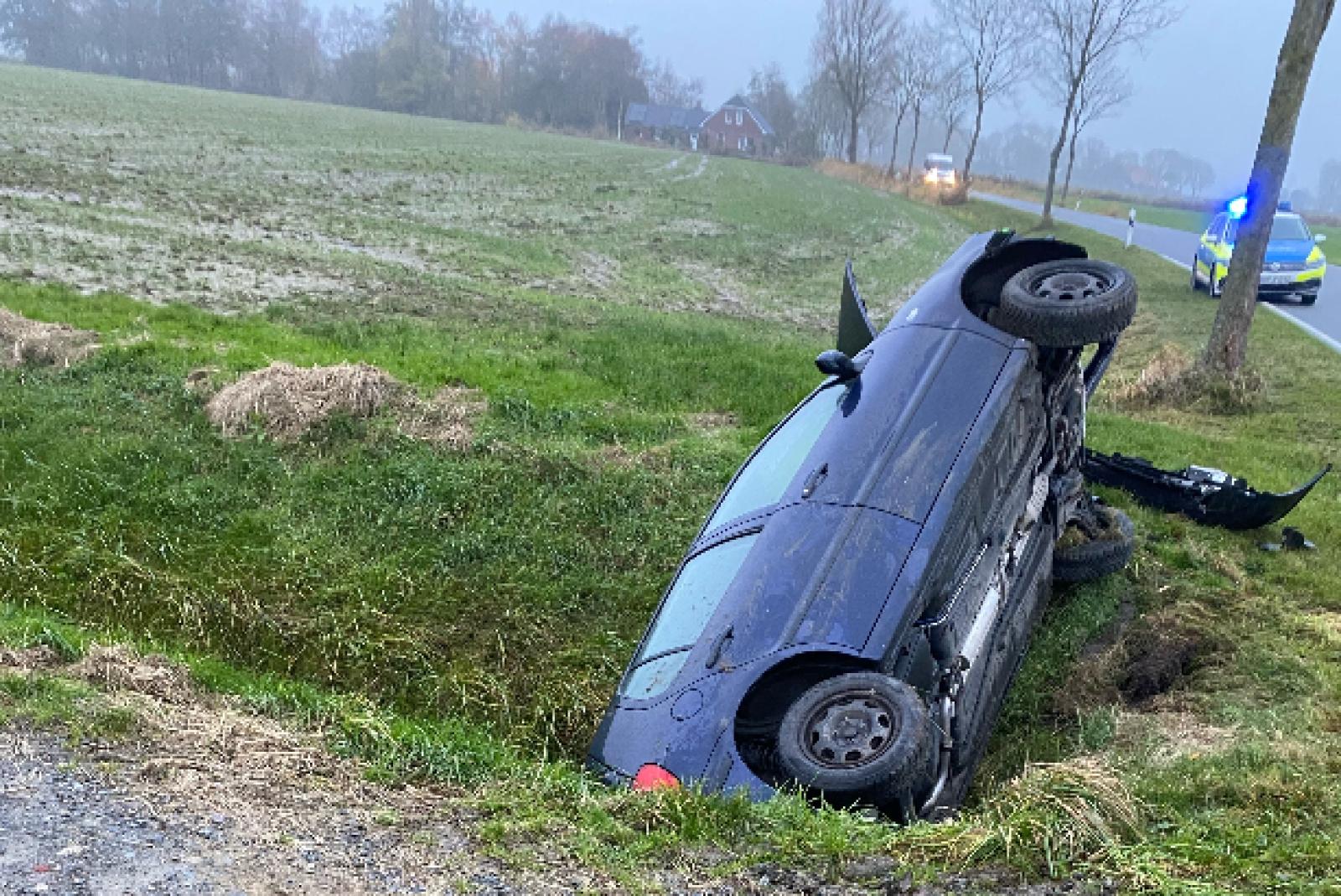 Am Ortsausgang von Westerbur (Gemeinde Dornum) kam ein Auto auf der Kreisstraße 22 von der Fahrbahn ab, touchierte eine Betonbegrenzung und landete in einem Zuggraben, der zum Sieltief führt.