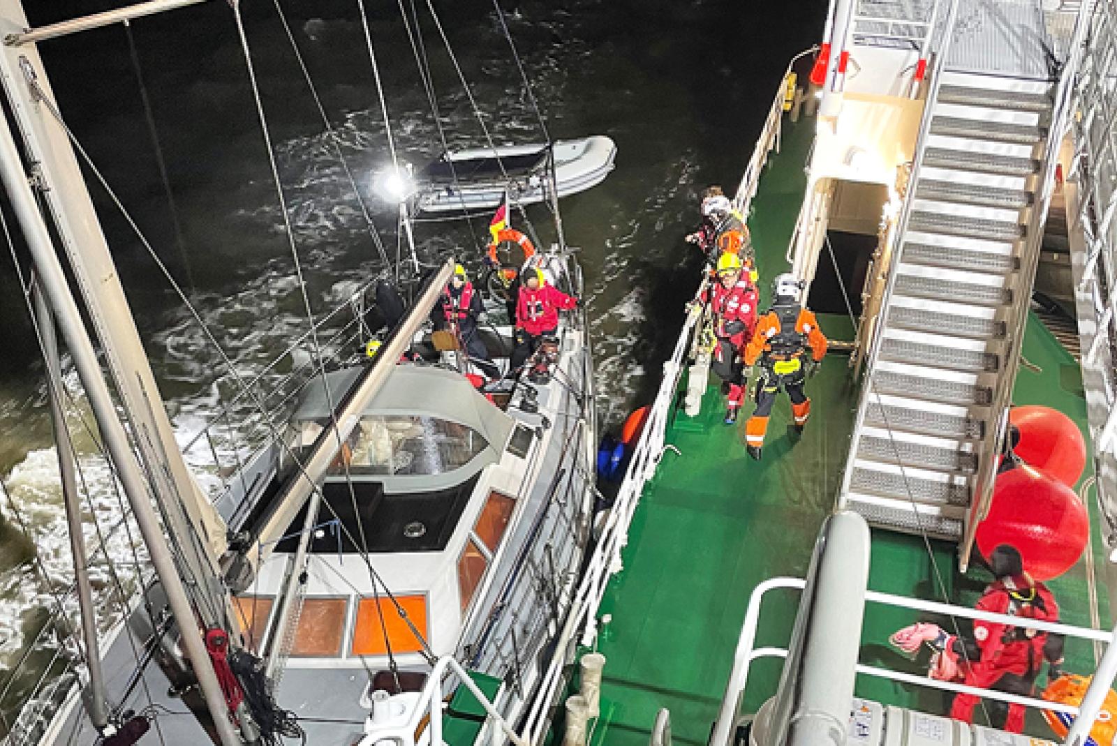 Gegen 19.30 Uhr traf die »Hermann Marwede« an der Yacht ein. Um angesichts der groben See keinerlei Risiken für Schiff und Besatzung einzugehen, entschieden die Seenotretter, den Havaristen zunächst noch ein Stück bis in die Jademündung zu begleiten, wo mit weniger Seegang zu rechnen war. Der verletzte Skipper war soweit stabil. Während der Reise beriet ein Notfallsanitäter der Johanniter am medizinischen Arbeitsplatz in der Seenotleitung der DGzRS die Besatzung der Segelyacht durchgängig über Funk.