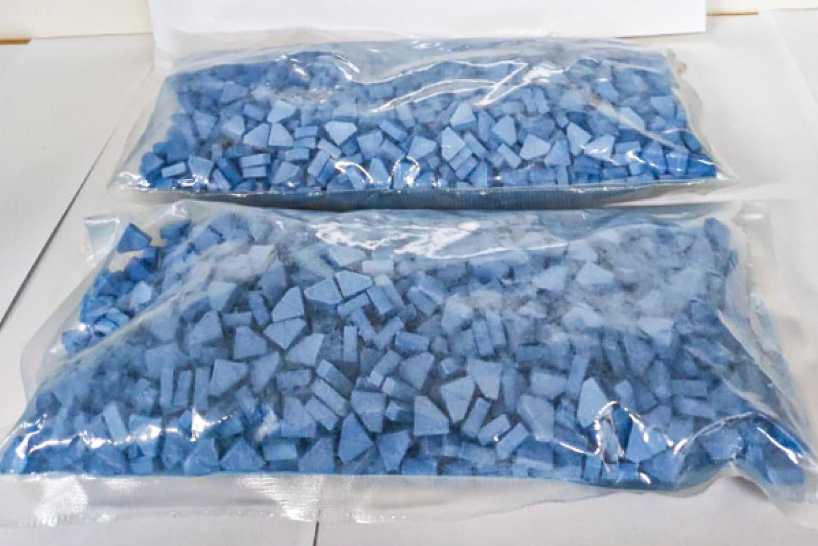 Im Rahmen der Personenkontrolle fiel den erfahrenen Zöllner schnell eine größere Menge Rauschgift in die Hände. Bereits der erste Blick in den Rucksack des einreisenden Mannes offenbarte zwei Kunststoffbeutel mit kleinen blauen Tabletten, auf die Totenkopfembleme gedruckt waren. Die nähere Überprüfung dieses Funds ergab, dass es sich um rund 1000 Gramm Ecstasy-Tabletten handelte.