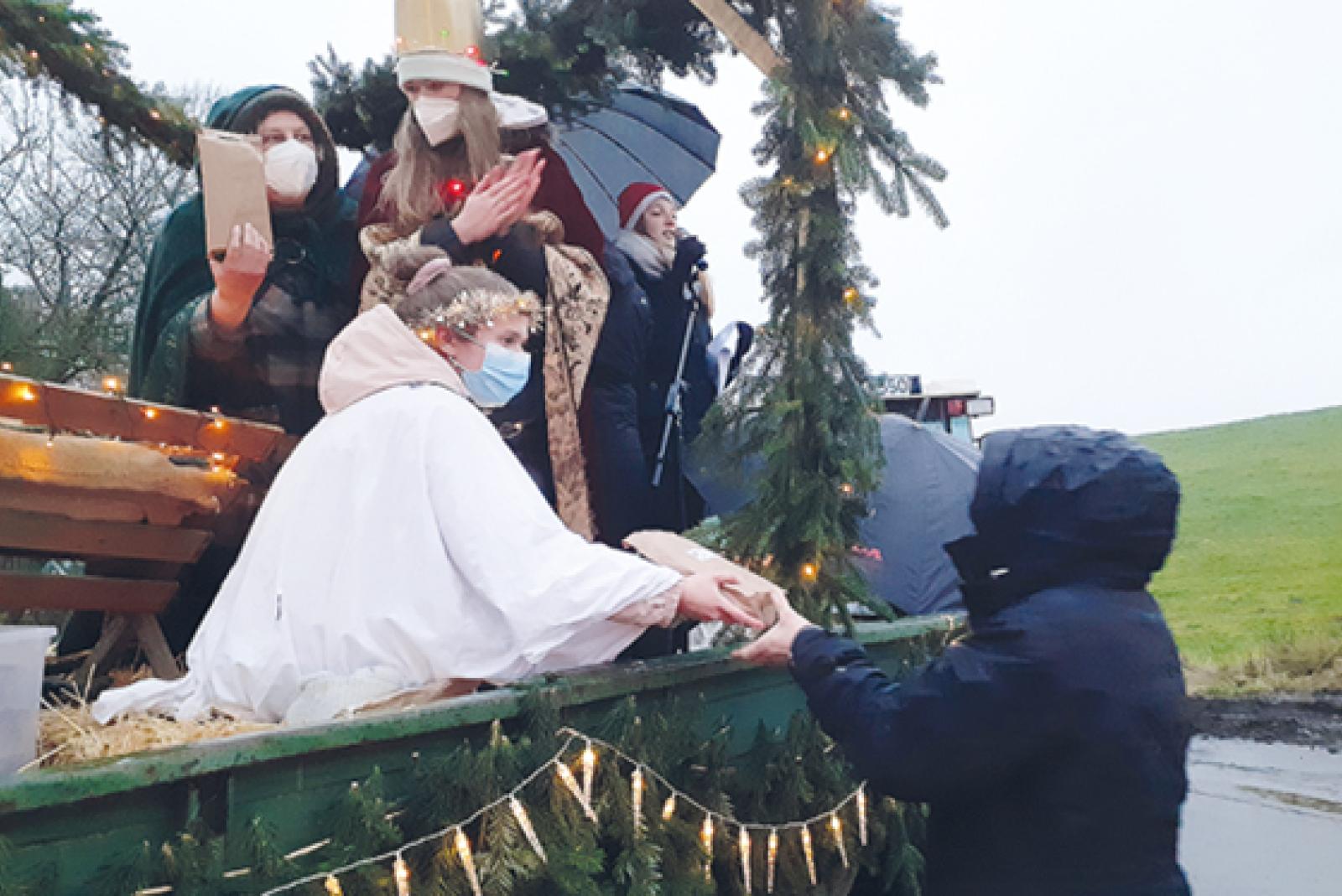 Weihnachten zu den Menschen bringen: Das war das Ziel der Pastorin Gretchen Ihmels-Albe und des Kindergottesdienst-Teams der Kirchengemeinde Kirchborgum. An Heiligabend machte sich die Gruppe deshalb mit einem weihnachtlich geschmückten Trecker-Anhänger von Ferstenborgum auf den Weg zur Kirche ...
