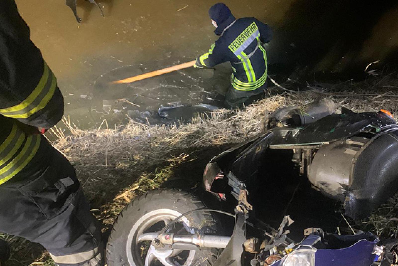 Vorbeifahrende Autofahrer hatten die Unfallstelle entdeckt, konnten aber keinen Rollerfahrer in der Umgebung ausfindig machen. Da die Eisdecke des Sieltiefs aufgebrochen war und sich Wrackteile auf dem Eis befanden, bestand die Gefahr, dass der Rollerfahrer ins Wasser gestürzt war oder sich unter dem Eis befand.
