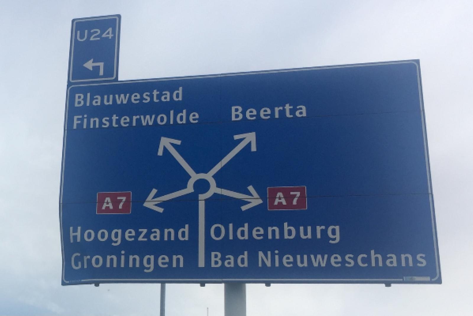 Die »Blauwe Roos« als millionenteurer Mega-Kreisverkehr an der Autobahn 7 bei Winschoten mit fünf verschiedenen Zu- und Ausfahrten ist seit der Inbetriebnahme in 2010 durch regelmäßige Staus ein Sorgenkind der Verkehrsplaner.