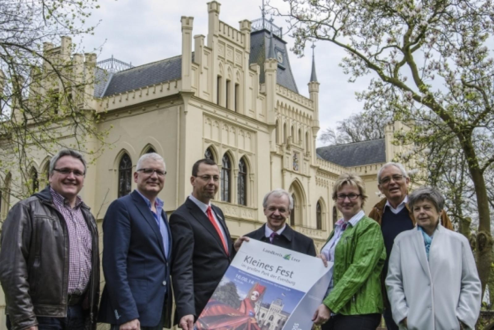 Scheuen keine Mühe fürs »Kleine Fest«: Kurt Radtke, Veranstalter Tourismus GmBH »Südliches Ostfriesland«, Conrad Lübbers, Orga-Team Zentrum für Gartenkultur Evenburg, Detlef Oetter, Sparkassen-Kulturstiftung LeerWittmund, Landrat Bernhard Bramlage, Signe Foetzki, Ostfriesische Landschaftliche Brandkasse, Harald Böhlmann Künstlerischer Direktor »Kleines Fest«, Ghita Cleri, Künstlerische Leitung »Kleines Fest« (von links). © Foto: Wübbena