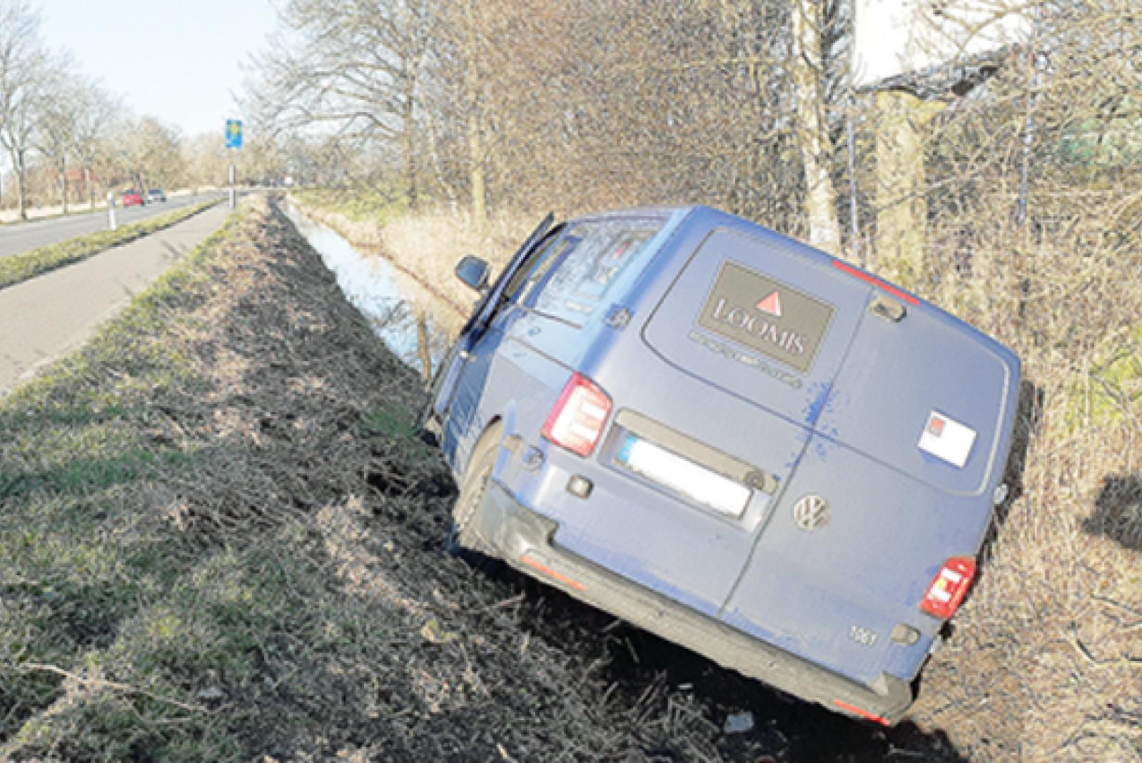 Neben der Bundesstraße 436 zwischen Weener und Leer landete heute Nachmittag um 15 Uhr ein Geldtransporter im Straßengraben. Zum genauen Unfallhergang konnte die Polizei bei Redaktionsschluss noch keine genauen Angaben machen. Mehrere Autos sollen in einer Kolonne auf der Straße Richtung Leer unterwegs gewesen sein, als es innerhalb der Kolonne zu einem riskanten Überholmanöver kam. Ob der Transporter aufgrund eines Ausweichmanövers im Graben landete, müsse noch geklärt werden, so die Polizei. Auch, ob der Transporter durch eine Berührung mit einem anderen Fahrzeug oder durch die Landung im Graben beschädigt worden sei, stünde noch nicht fest. Der 69-Jährige Beifahrer wurde leicht verletzt. Der Fahrer blieb unverletzt.