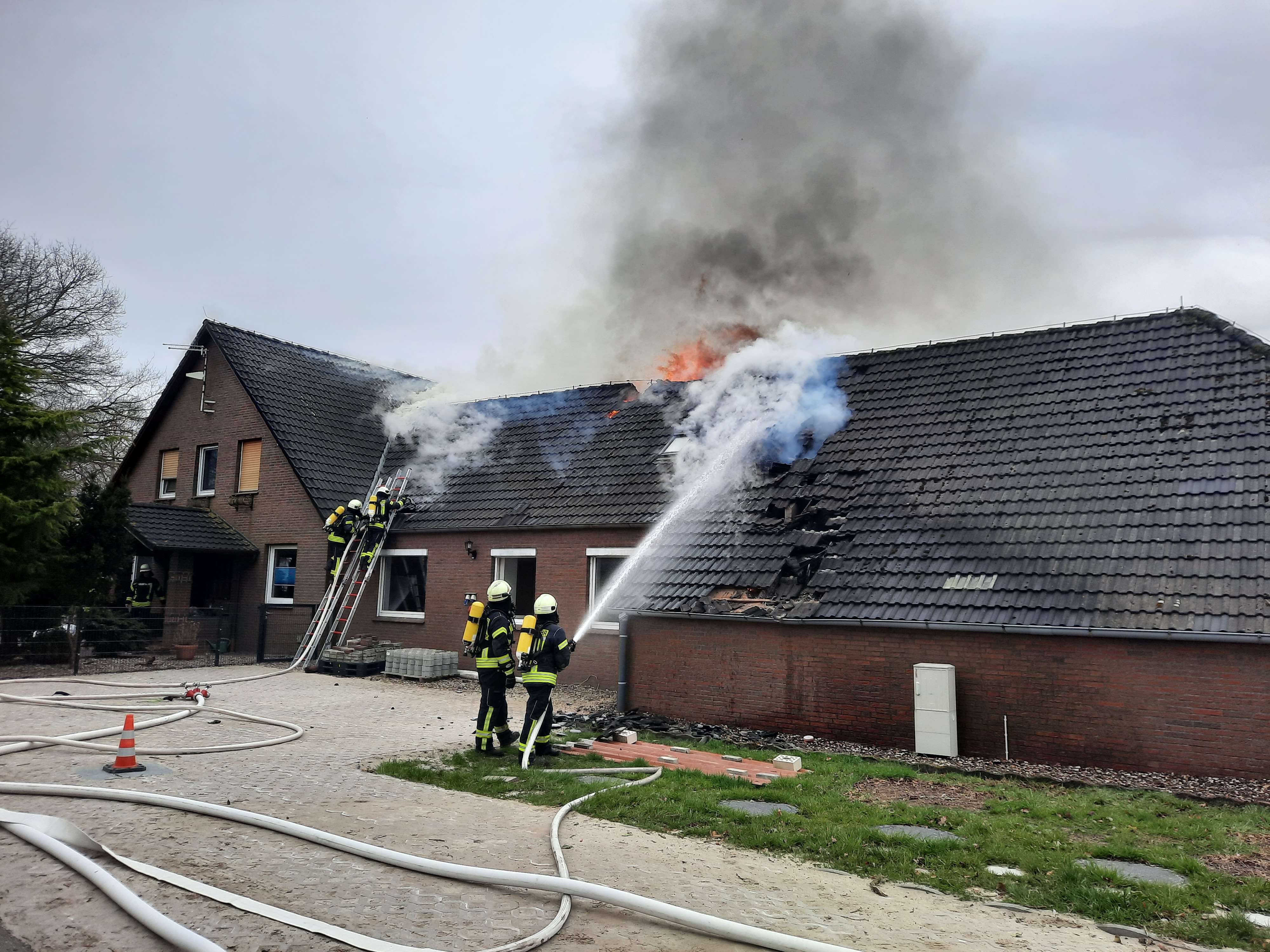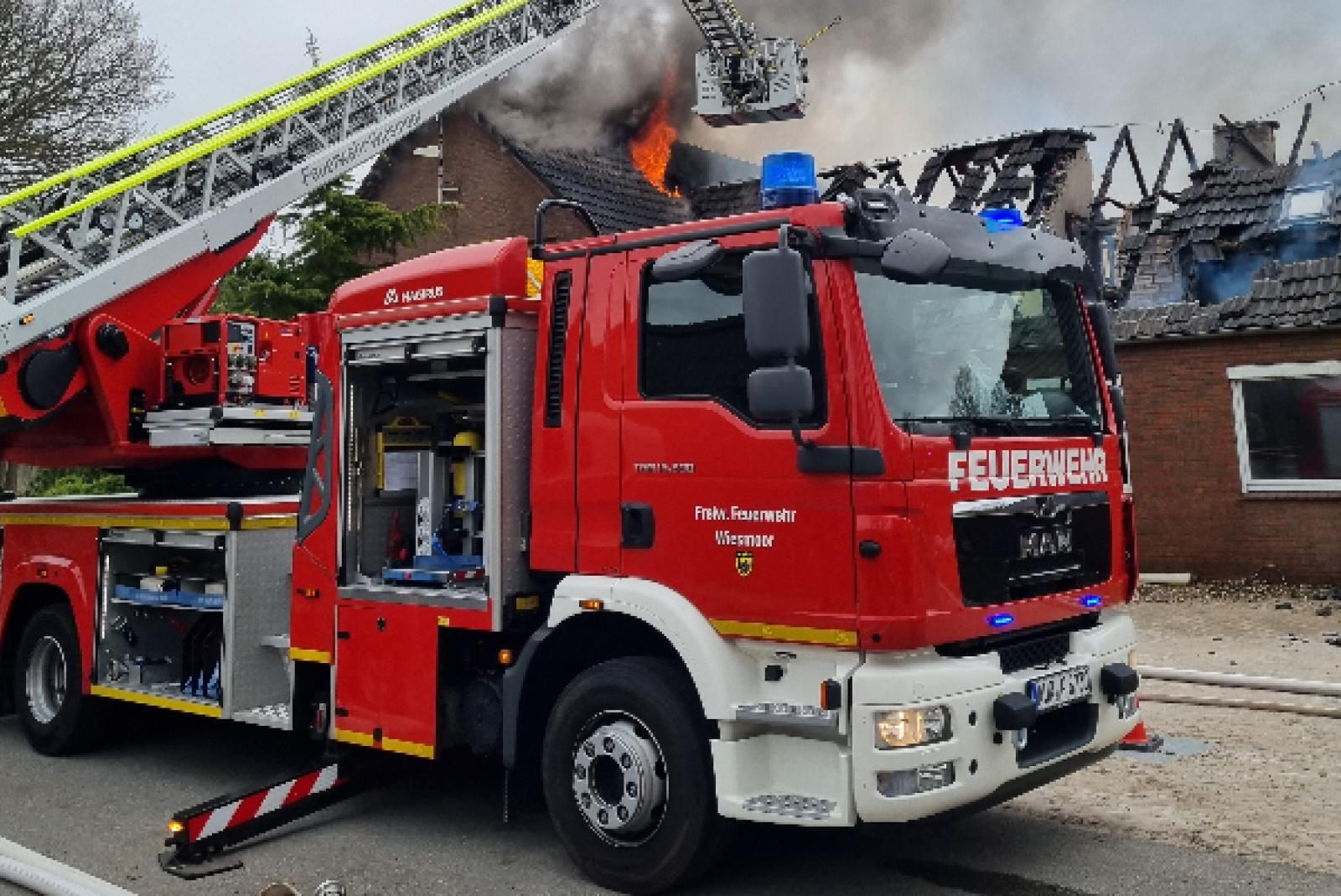 Durch einen Brand im Leekenweg in Fiebing (Gemeinde Großefehn) sind am Samstagmittag ein Wohnhaus und eine Scheune zerstört worden. Über 100 Feuerwehrleute rückten mit 16 Fahrzeugen aus, um die Flammen zu bekämpfen.