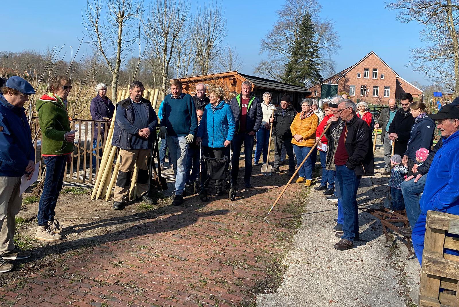 In Weenermoor warteten am Samstagvormittag 20 Männer und Frauen mit Spaten und Baum bei idealem Frühlingswetter fast etwas ungeduldig darauf, einen Obstbaum einbuddeln zu können, für den sie die Patenschaft übernommen hatten.