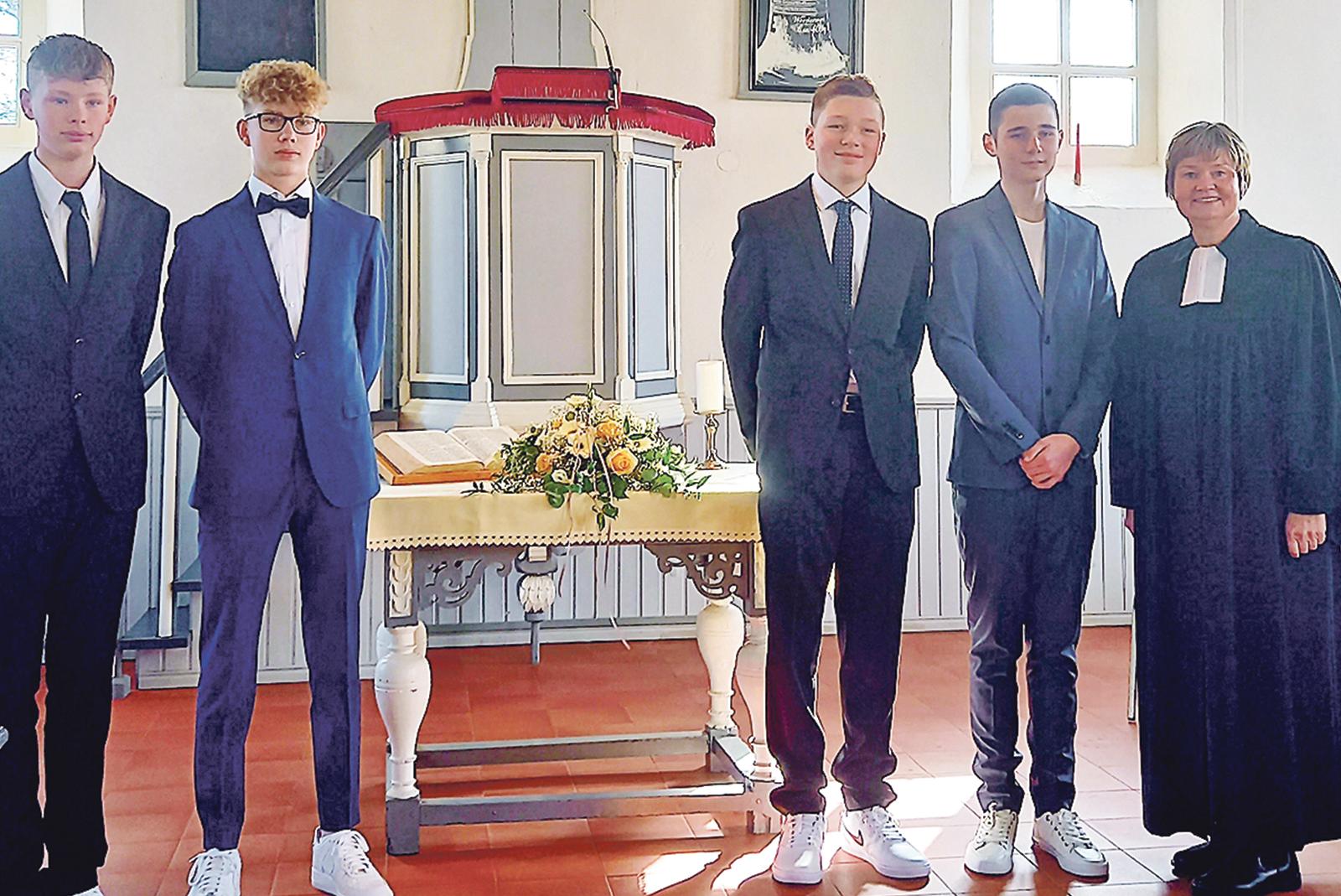 Vier Jugendliche hat Pastorin Anne Ulferts jetzt im Gottesdienst in Weenermoor konfirmiert. Unser Foto zeigt von links Louis Berends, Joost Battermann, Jan Schoormann, Ben Randt und Anne Ulferts. Pastorin Anne Ulferts nahm in ihren Worten an die Konfirmanden Bezug auf ...