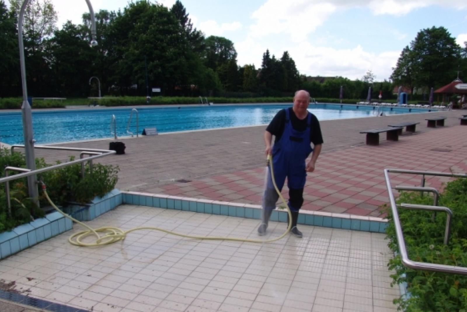 Schwimmmeister Günter Kloster packt im Leeraner Freibad kräftig mit an. © Foto: Boelmann