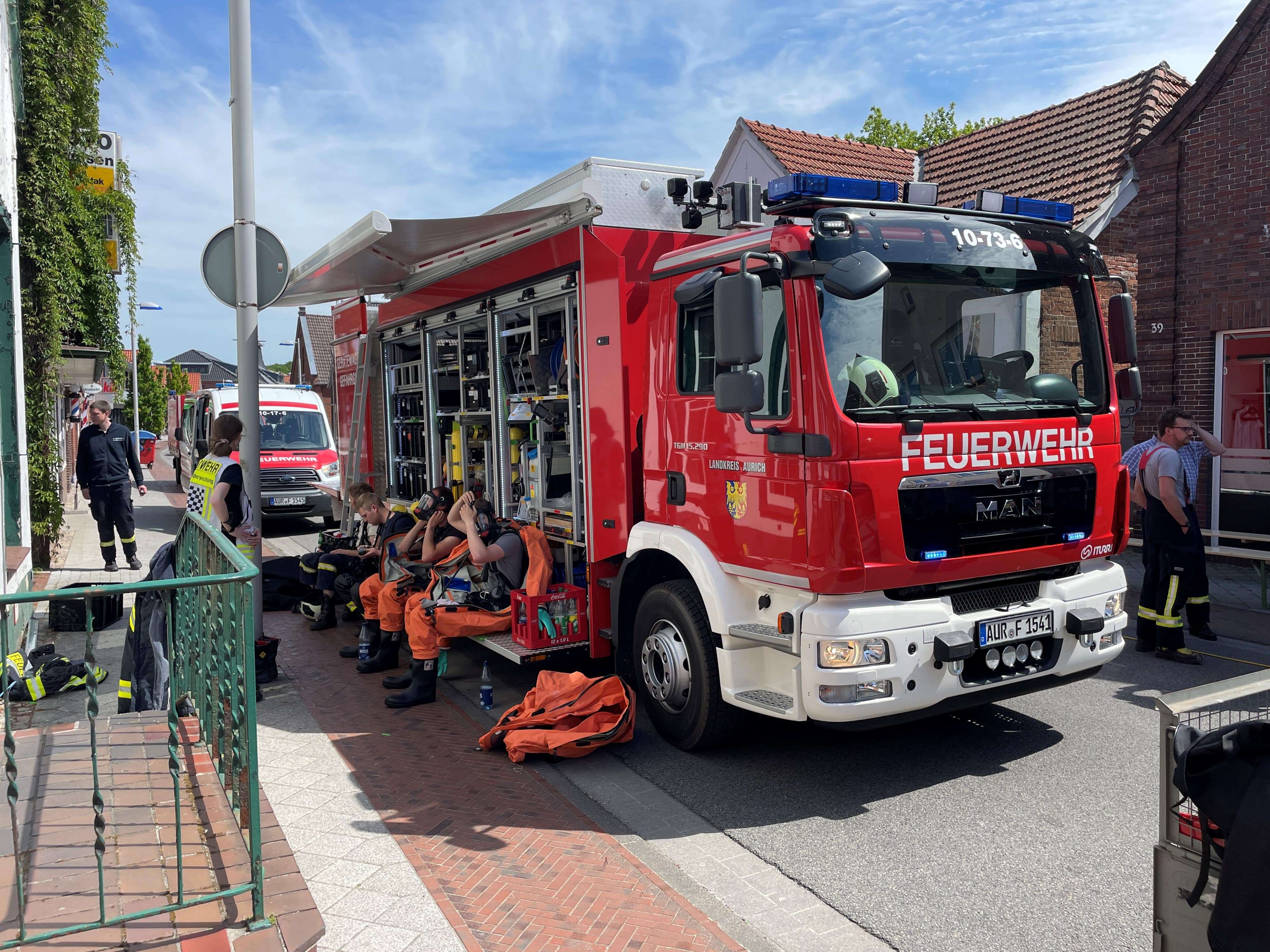 Einsatzkräfte der Norder Feuerwehr gingen in Chemikalienschutzanzügen in das Gebäude zunächst zur Erkundung. Nachdem erste Erkundungsergebnisse vorlagen, wurde der bei der Ortsfeuerwehr Aurich-Sandhorst stationierte Gefahrgutzug des Landkreises Aurich hinzugezogen. Auch die gesamte Ortsfeuerwehr Hage wurde für Absperrmaßnahmen und Reinigungsarbeiten nachalarmiert.