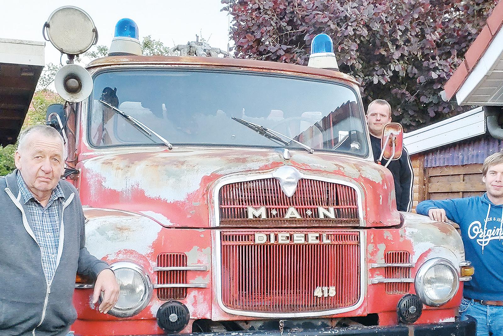 Ein freudiges wie unverhofftes Wiedersehen feierte Feuerwehr-Urgestein Heinrich Akkermann (links) aus Weener jetzt: Seine Söhne Timo (vorne rechts) und Ingo hatten ein altes MAN-Tanklöschfahrzeug der Feuerwehr Weener per Zufall im Internet entdeckt und spontan erworben. Der ...