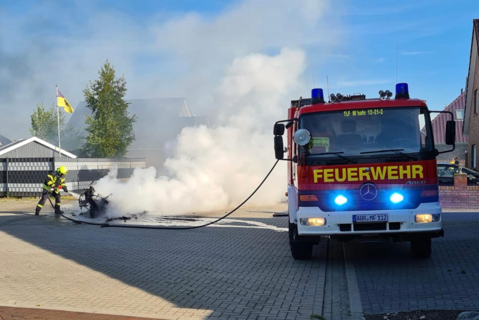 Am Donnerstagabend geriet gegen 18.30 Uhr ein Motorrad auf einem Wendehammer in der Weserstraße in Marienhafe im Landkreis Aurich in Brand. Die Feuerwehren Marienhafe und Upgant-Schott wurden zur Brandbekämpfung alarmiert. Schnell wurde das Feuer mit Hilfe des Wassertanks vom Tanklöschfahrzeug gelöscht. Neben der Feuerwehr waren die Polizei, die Untere Wasserbehörde, der Bauhof der Samtgemeinde und ein Abschleppunternehmen vor Ort im Einsatz.