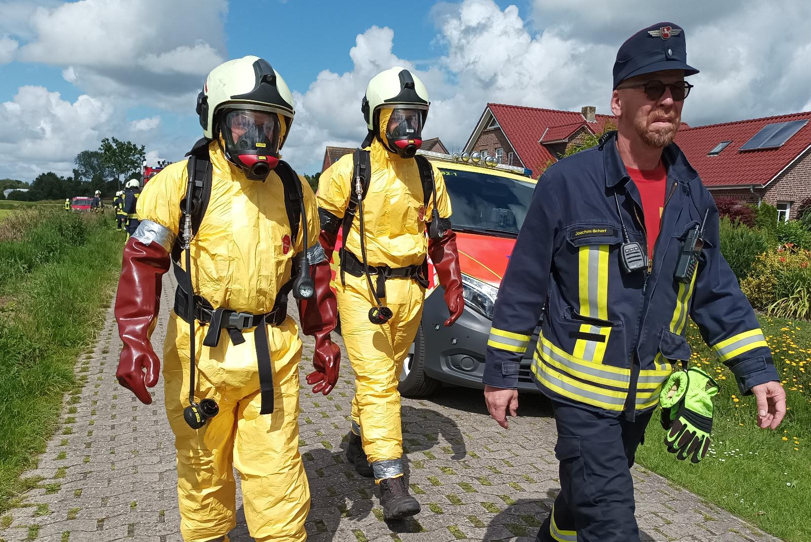 Wie die Feuerwehr weiter berichtet, wurde der Gemeidebrandmeister der Freiwilligen Feuerwehr Brookmerland in den Osterupganter-Aäcker-Weg in Upgant-Schott alarmiert, da dort Chlorgranulat umgekippt war. Nach einer kurzen Erkundung ließ dieser gegen 10.28 Uhr umgehend den Gefahrgutzug der Kreisfeuerwehr Aurich alarmieren, da nicht unerhebliche Mengen Chlorgas freigesetzt wurden. Die Einsatzfahrzeuge des Gefahrgutzuges sind bei der Feuerwehr Sandhorst stationiert. Ergänzt wird der Gefahrgutzug durch den ABC-Erkunder, der dem ABC-Zug zugeordnet und bei der Feuerwehr Osterhusen stationiert ist. Die direkten Nachbarn wurden umgehend informiert, Fenster und Türen geschlossen zu halten, da sich die Chlorgase über den seichten Wind ausbreiteten. Eine Sicherheitszone wurde eingerichtet, welche sich auch über den Osterupganter-Aäcker-Weg hinweg zog, sodass die Straße für die Zeit der Arbeiten gesperrt war.