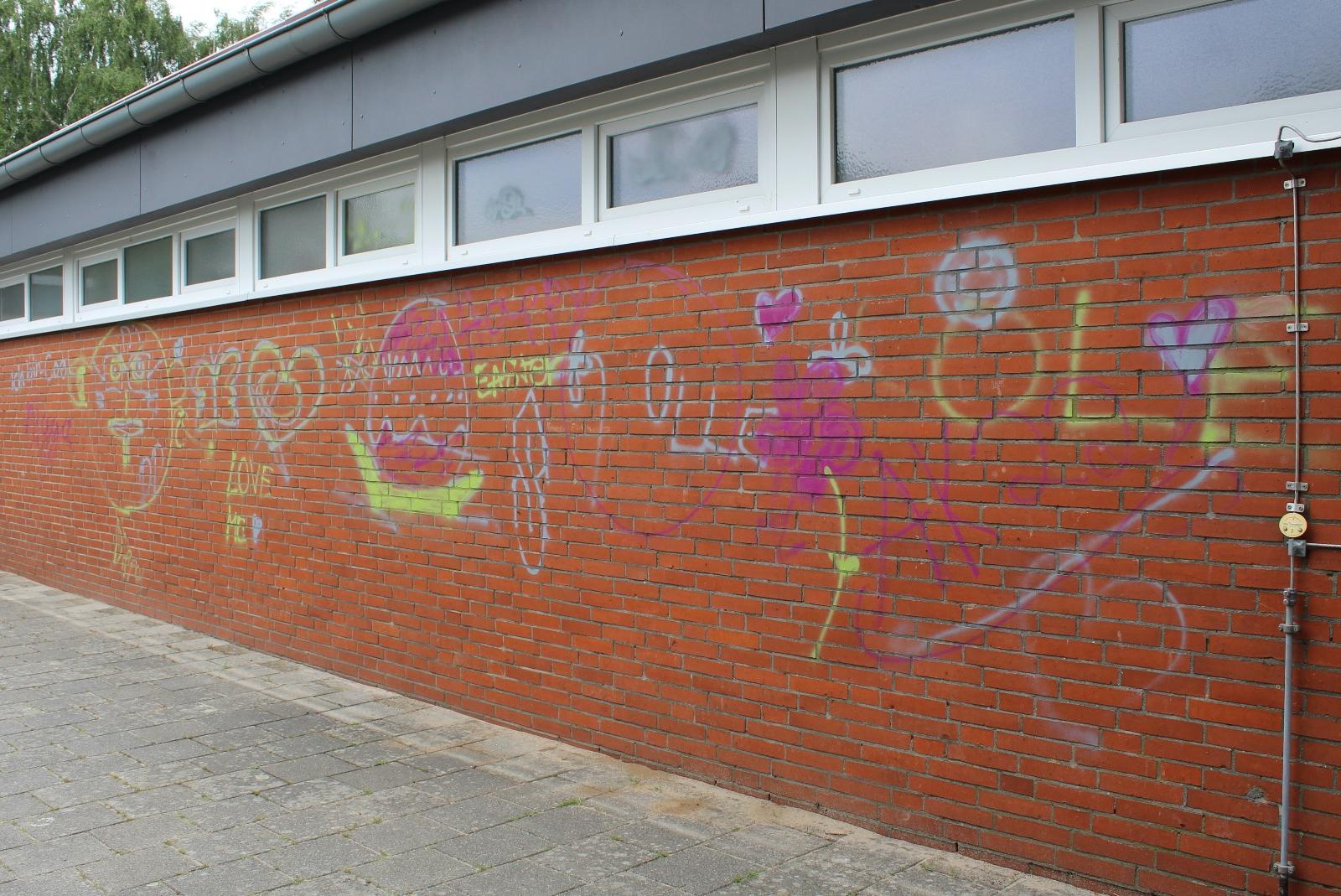 Die Grundschule in Holthusen ist von Schmierfinken heimgesucht worden. An diversen Gebäuden wurden mit Sprühfarbe Sprüche und Zeichnungen aufgetragen.