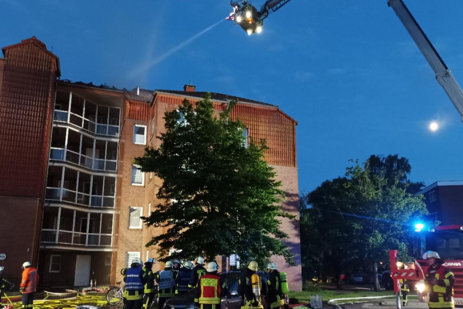 Großeinsatz in Emden-Borssum: Wegen eines Dachstuhlbrandes in einem Mehrparteienhaus waren am Freitagabend insgesamt 150 Einsatzkräfte vor Ort. Allein die Feuerwehr rückte mit 29 Fahrzeugen aus. Wie die Polizei mitteilte, erlitt ein 90-jähriger Bewohner eine Rauchvergiftung und wurde in ein Krankenhaus gebracht. Eine 73-jährige Bewohnerin des Nachbarhauses musste ebenfalls in ein Krankenhaus eingeliefert werden, wo sie kurz darauf verstarb. Ihr Tod steht laut der Polizei jedoch nicht in Zusammenhang mit dem Brand. Der entstandene Schaden wird nach ersten Schätzungen auf 1,5 Millionen Euro beziffert. Durch den Brand und die Löscharbeiten ist das vierstöckige Gebäude vorerst nicht bewohnbar.