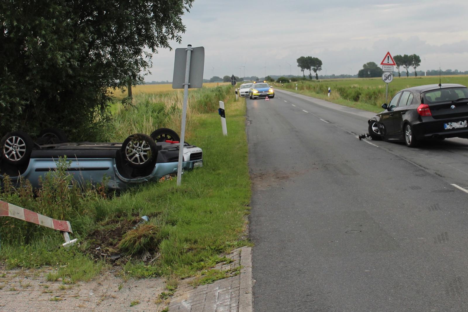 Den Angaben zufolge waren der Emder und der gleichaltrige Krummhörner hintereinander mit ihren Autos in Richtung Emden unterwegs. Als der Emder mit seinem BMW nach links in die Oderstraße einbiegen wollte, setzte der Krummhörner mit seinem Skoda zum Überholen an. Es kam zum seitlichen Zusammenstoß, woraufhin der Skoda auf dem Dach in einem Graben landete. Beide Wagen wurden dabei erheblich beschädigt und mussten durch Abschleppunternehmen geborgen werden. Für die Dauer der Bergungsmaßnahmen war die L2 voll gesperrt. Da Betriebsstoffe aus dem BMW ausliefen, wurde um 6.27 Uhr die Ölschadensgruppe der Ortsfeuerwehr Krummhörn-Nord alarmiert. Die Einsatzkräfte streuten die ausgelaufenen Betriebsstoffe ab.