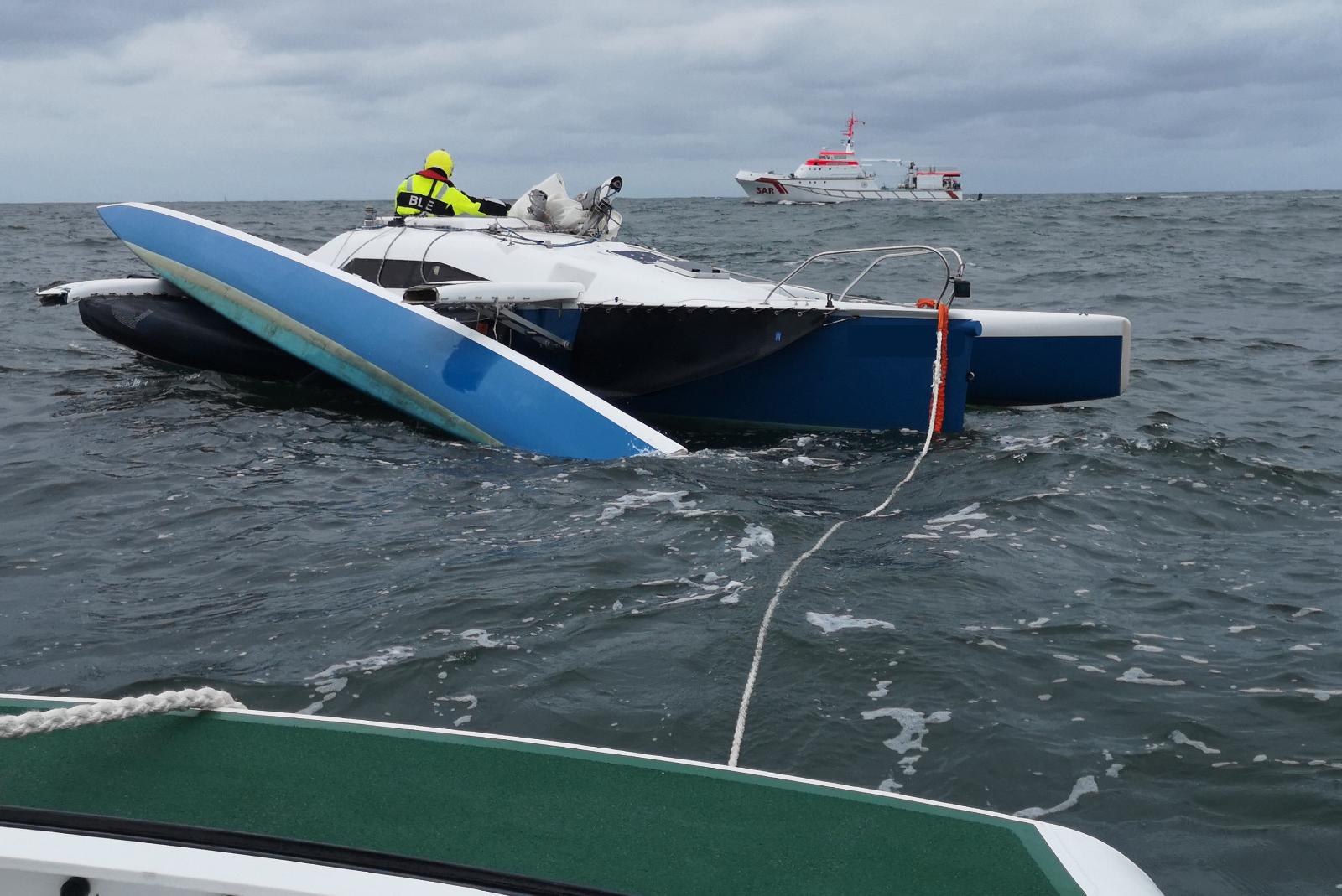 Gemeinsam gelang es, eine Schleppverbindung zum Seenotrettungsboot herzustellen. Der angebrochene Schwimmkörper lief jedoch voll Wasser, so dass der Havarist in Gefahr geriet, zu sinken. Ebenso behinderte das gebrochene Rigg, das noch mit Segeln im Wasser hing, die Schleppversuche, da es die noch intakten Schwimmkörper zu beschädigen drohte.