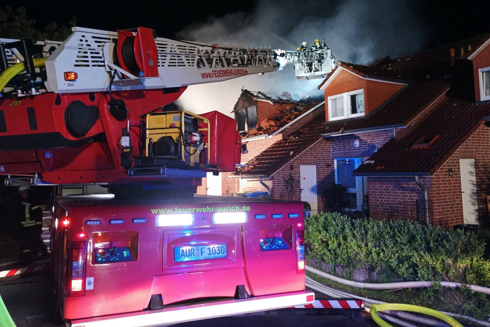 Das Feuer in einem Mehrfamilienhaus in Uthwerdum (Gemeinde Südbrookmerland) ist gegen 2.30 Uhr ausgebrochen. Um diese Uhrzeit meldeten Anwohner per Notruf ein Feuer in einer Wohnung in der Lilienstraße. Als die Einsatzkräfte der Feuerwehr und Polizei vor Ort eintrafen, stand der Dachstuhl des Hauses bereits in Vollbrand.
