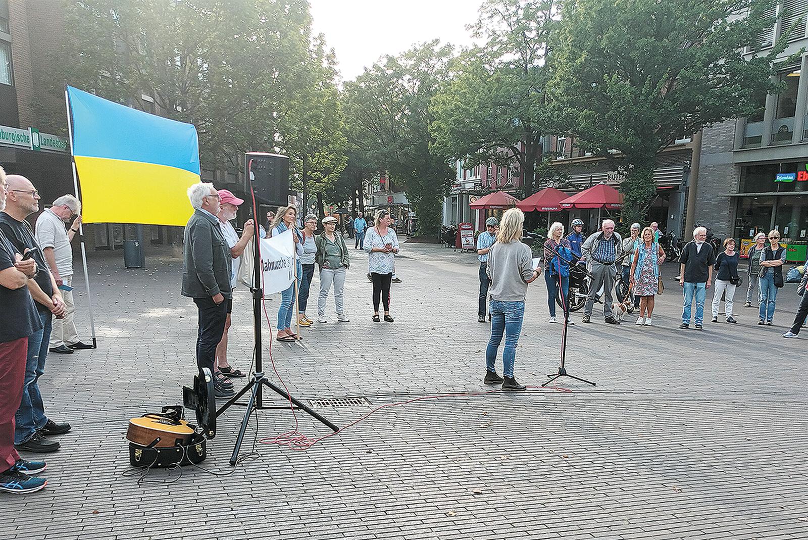 Seit einem halben Jahr finden jeden Montag auf dem Denkmalplatz in Leer Mahnwachen anlässlich des Ukraine-Krieges statt. Bei der jüngsten Mahnwache äußerte Mechthild Tammena angesichts der Meldungen aus dem Kriegsgebiet »eine gewisse Hilflosigkeit«.